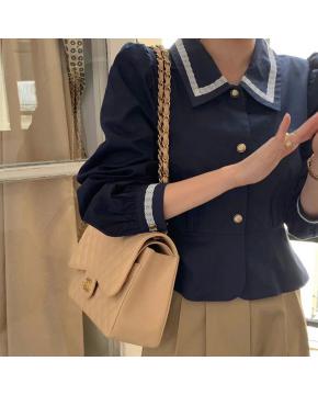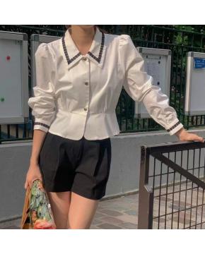 法式复古小众撞色娃娃领蕾丝拼接泡泡袖衬衫上衣