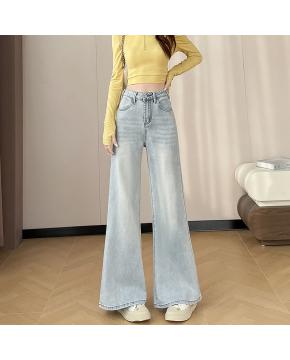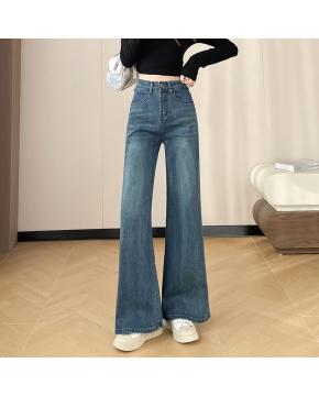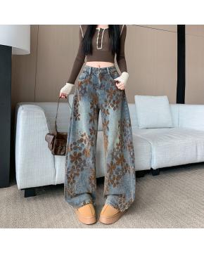 美式做旧印花弯刀牛仔裤新款高腰宽松阔腿镰刀裤