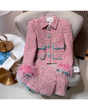 粉色粗花呢套装新款高级感小香风羽毛拼接外套半裙两件套