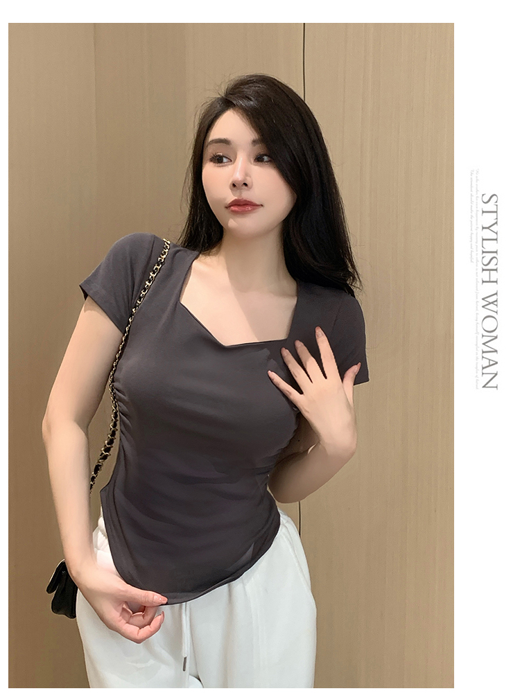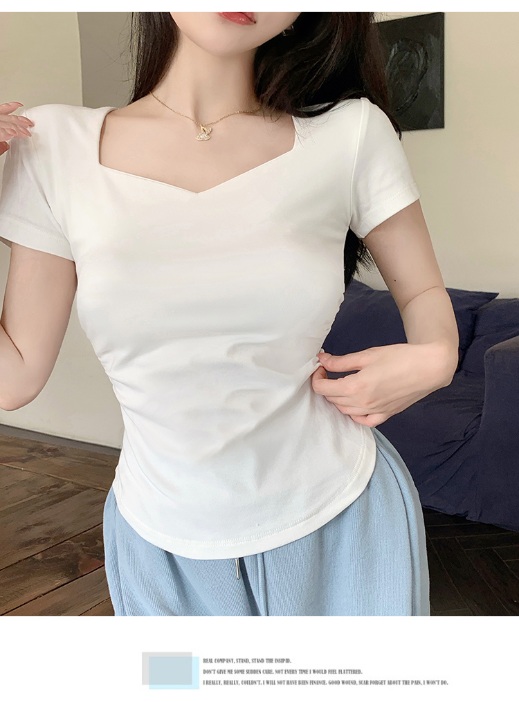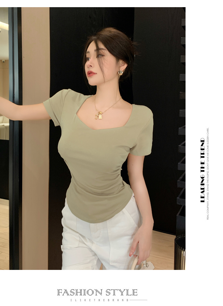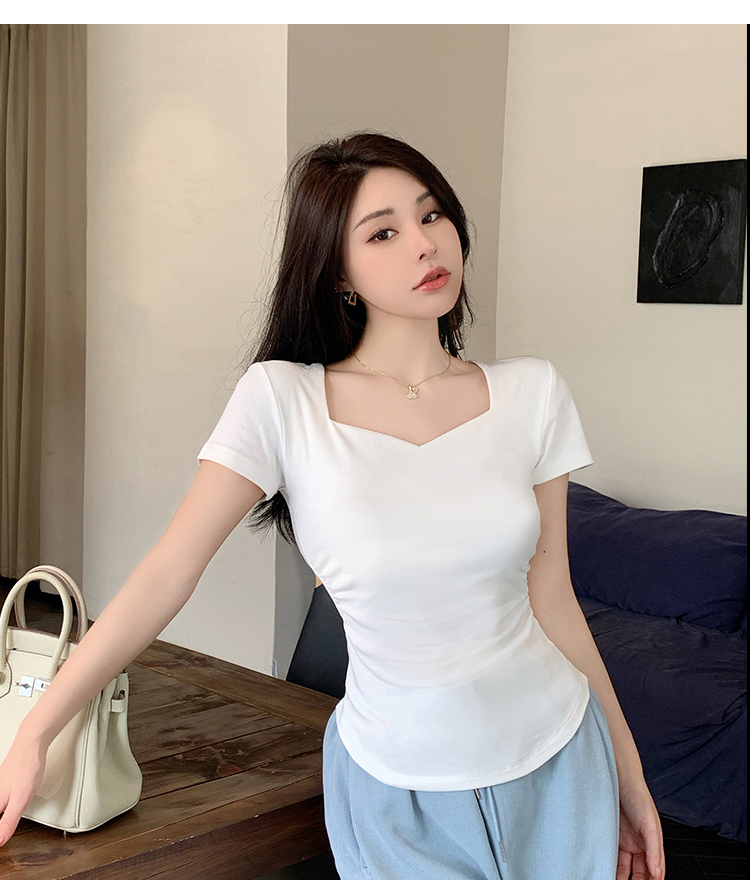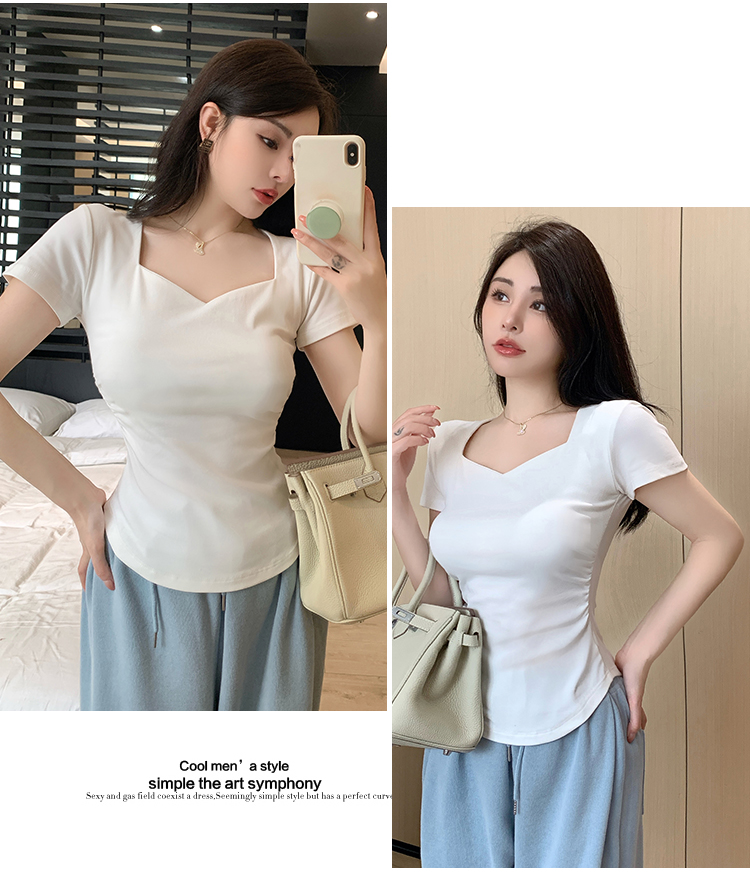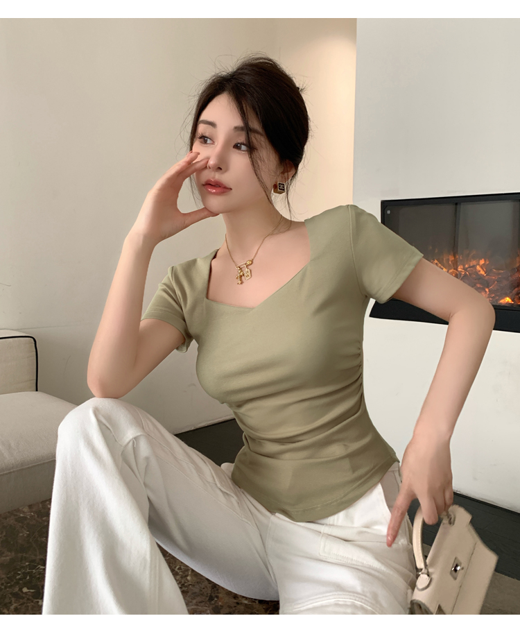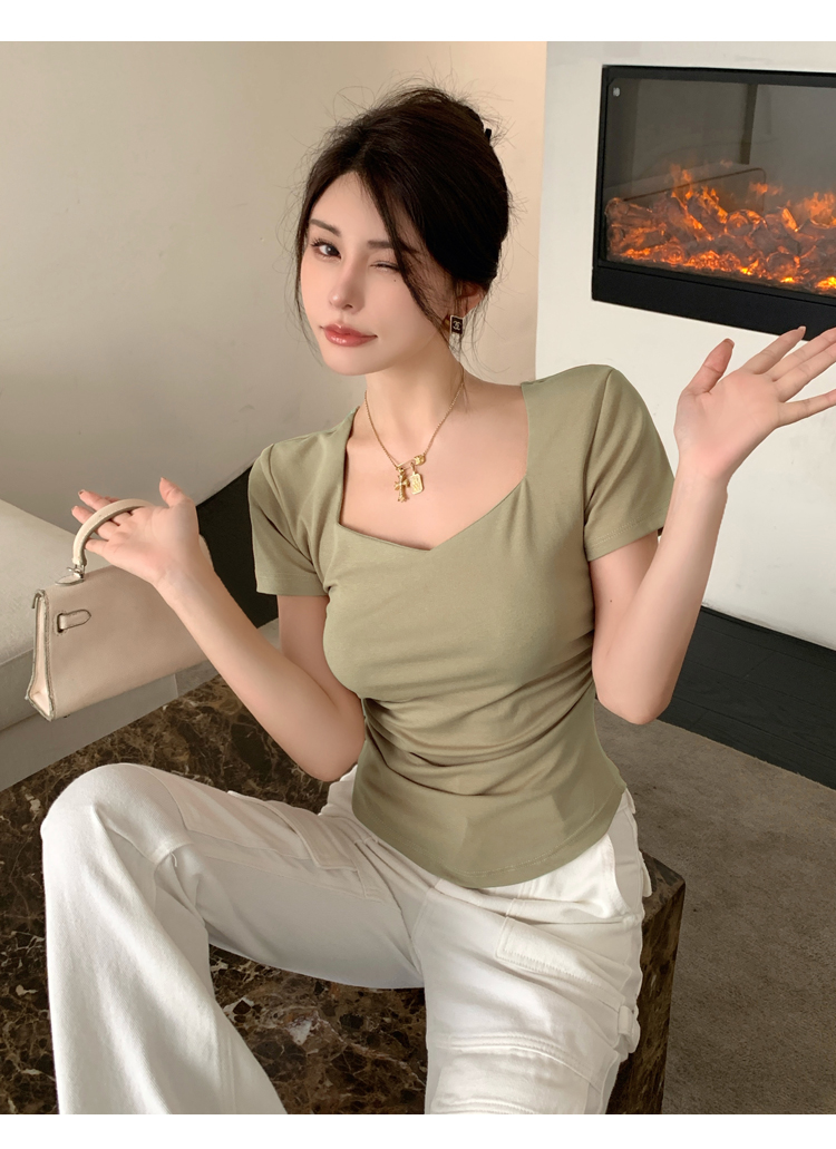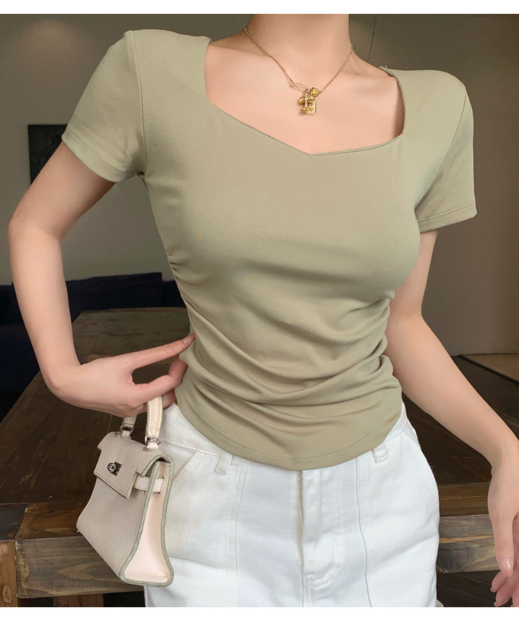 春夏季韩版气质海鸥领褶皱纯色纯棉短袖T恤辣妹纯欲上衣女