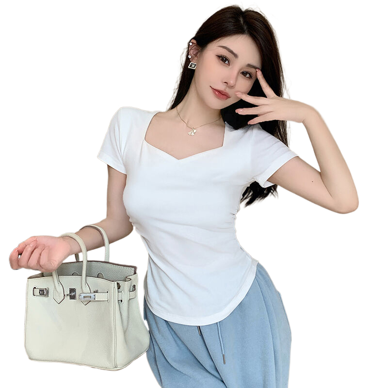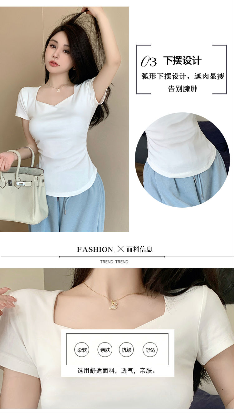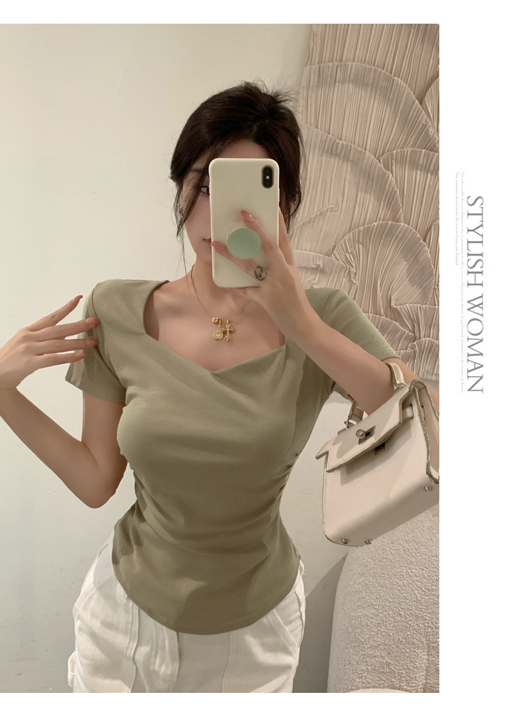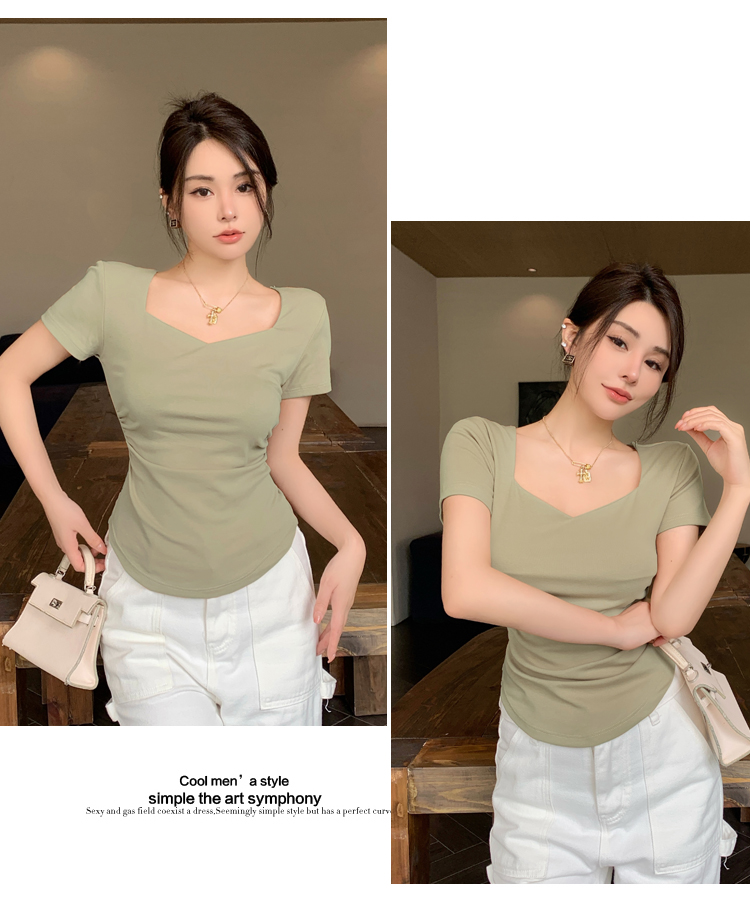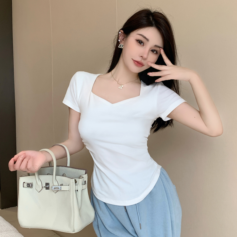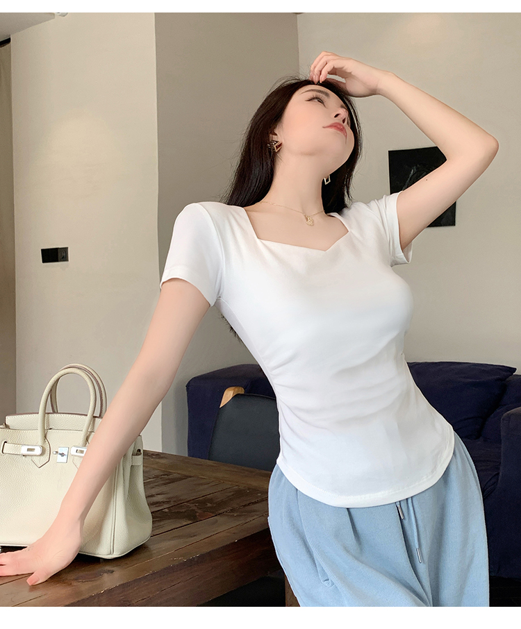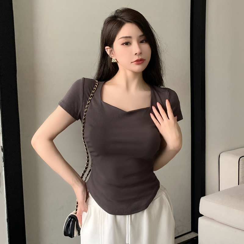 春夏季韩版气质海鸥领褶皱纯色纯棉短袖T恤辣妹纯欲上衣女