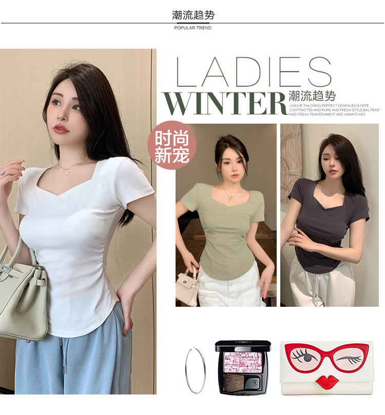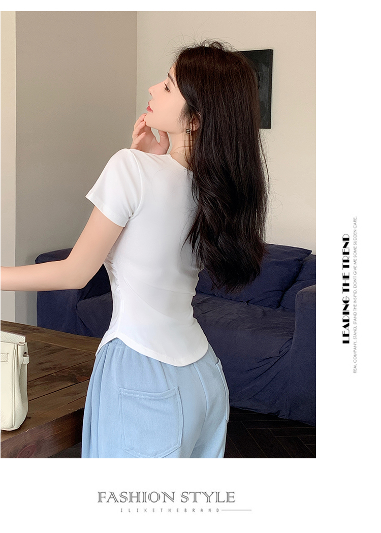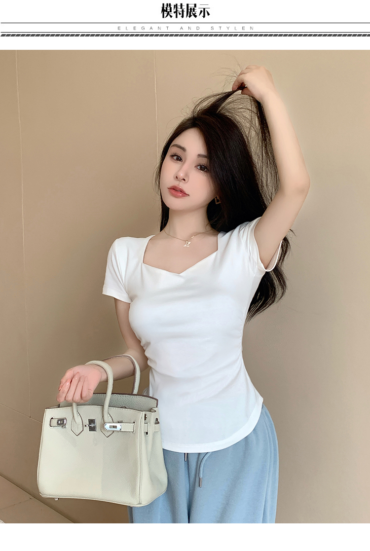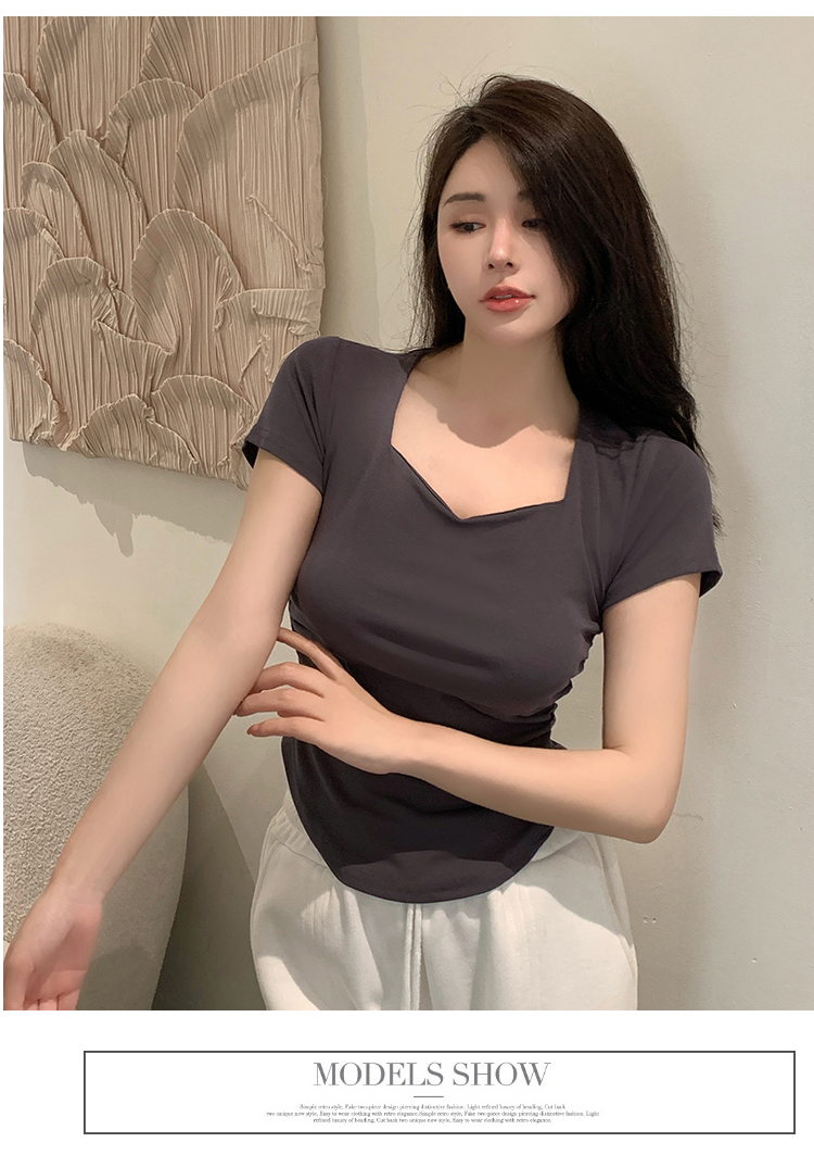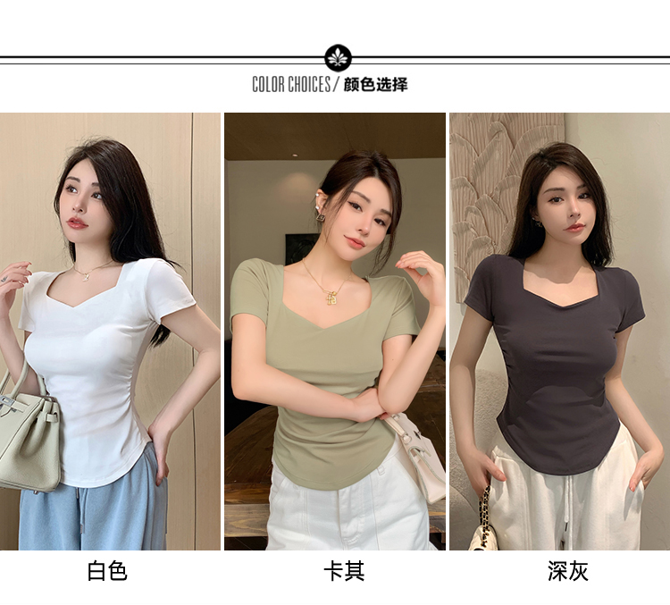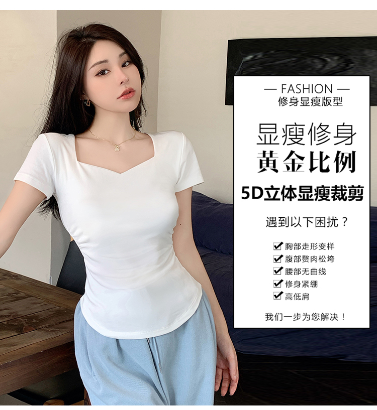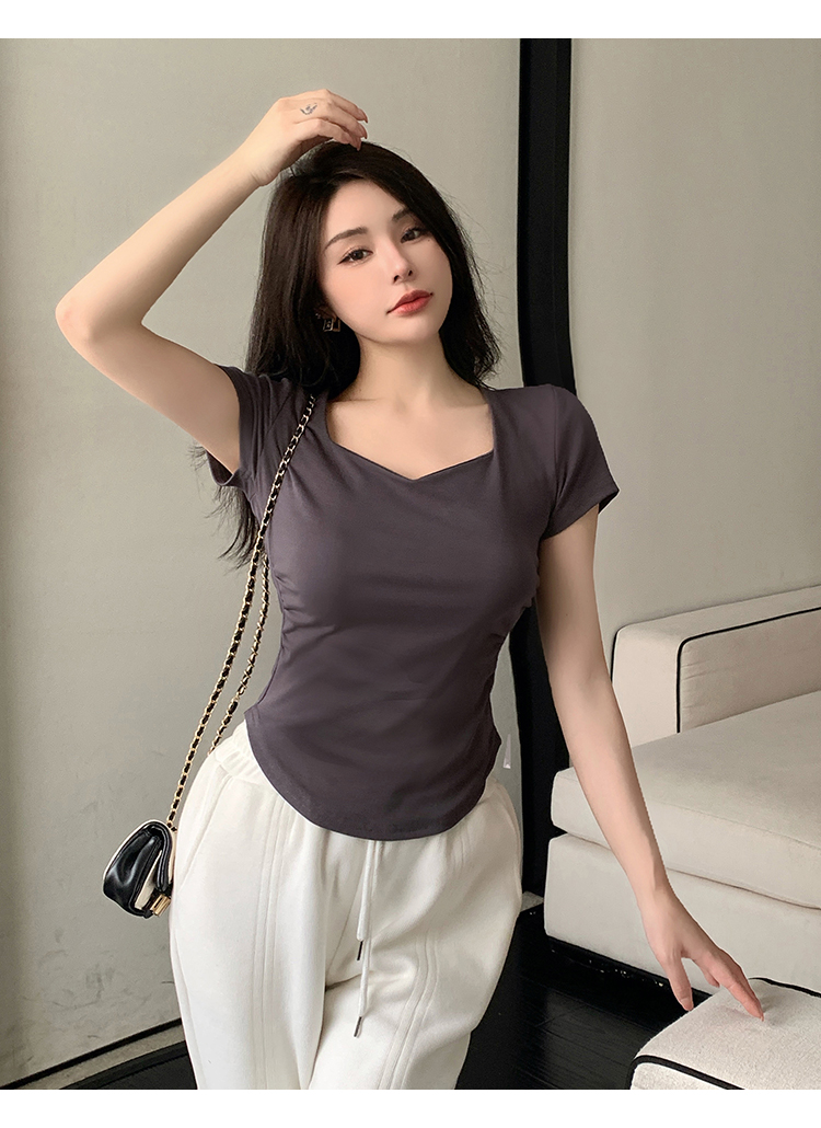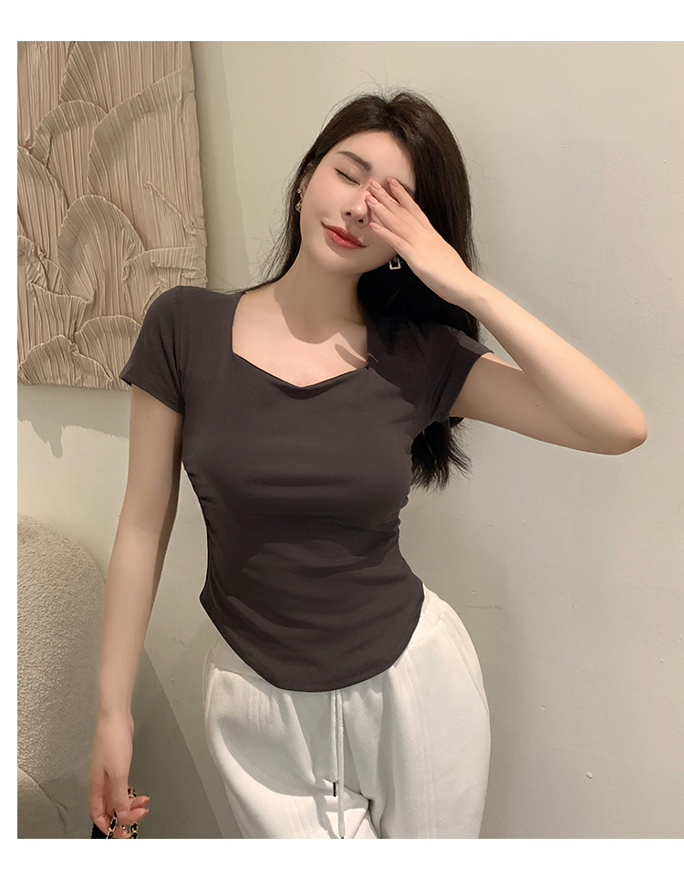 春夏季韩版气质海鸥领褶皱纯色纯棉短袖T恤辣妹纯欲上衣女