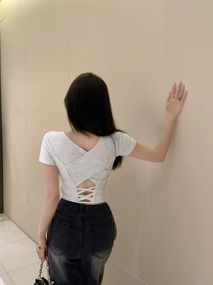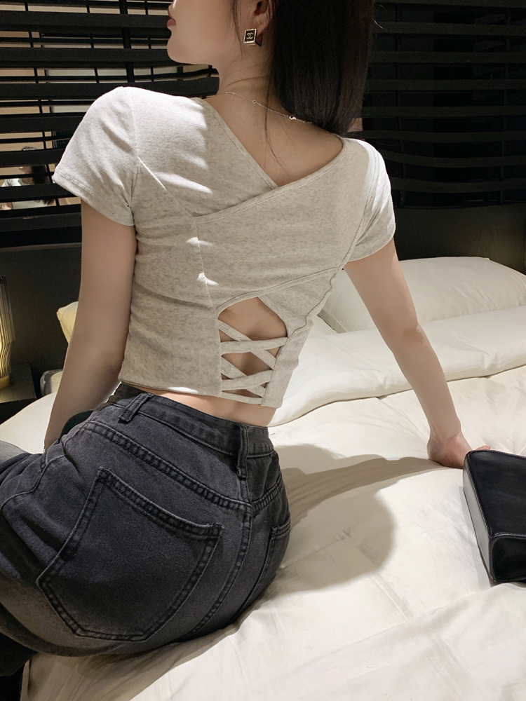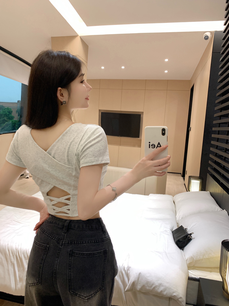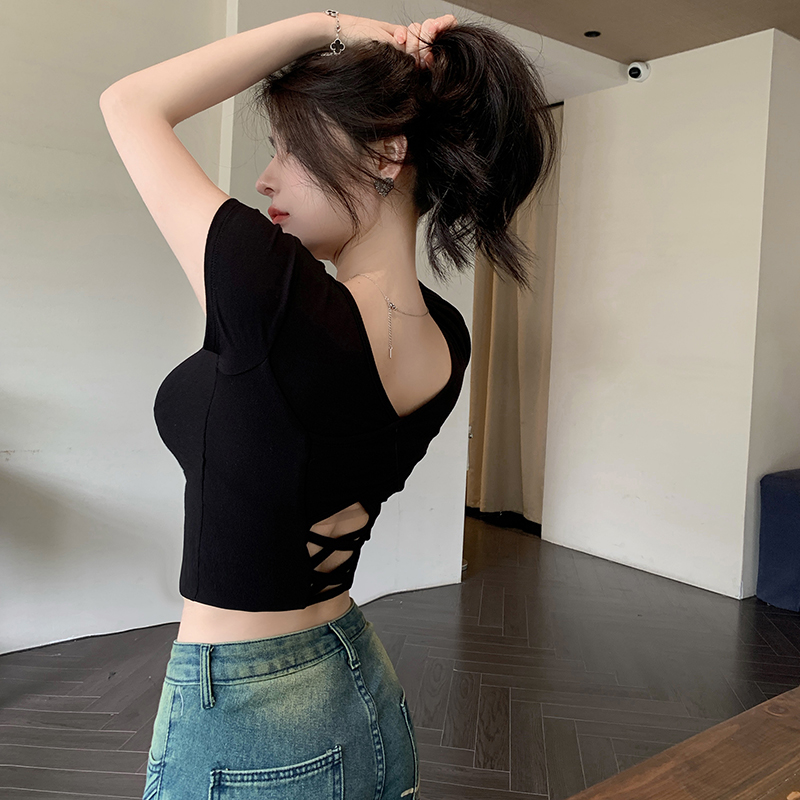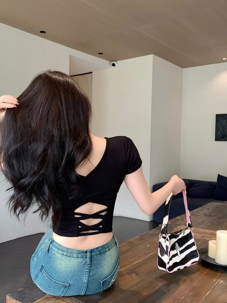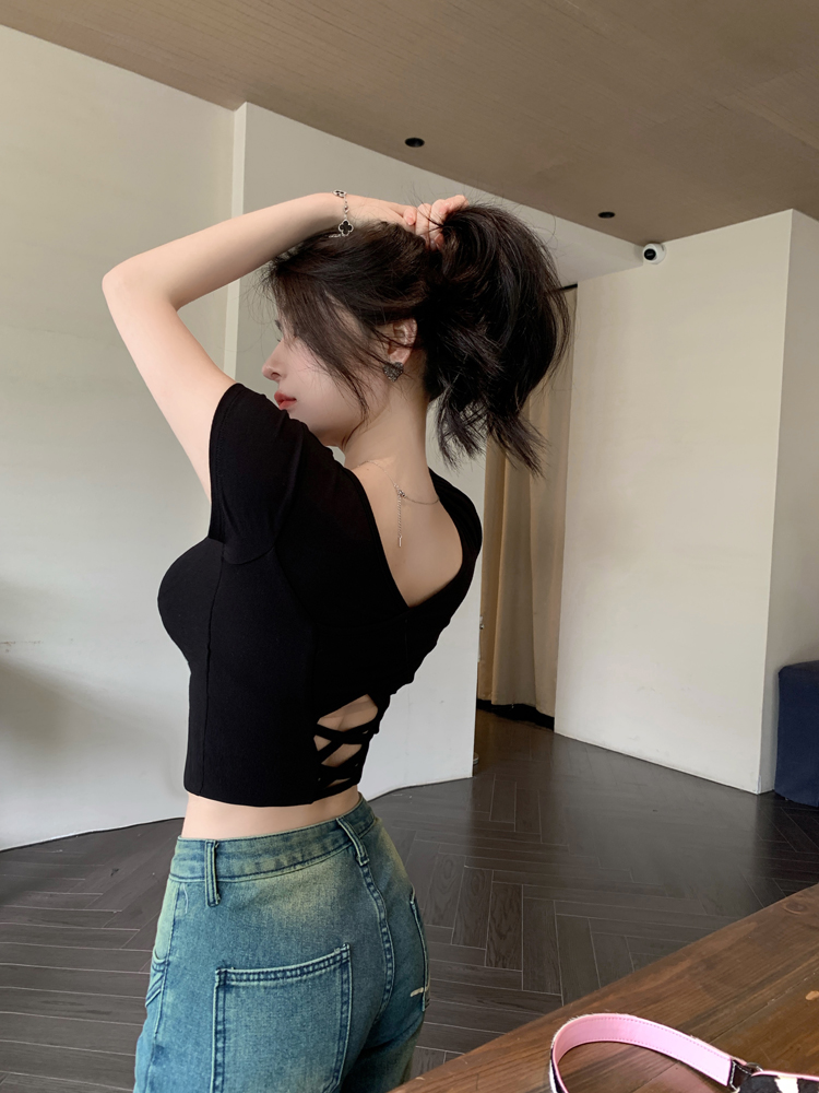 纯欲风夏季辣妹镂空美背正肩短袖T恤女小众设计显瘦短款上衣