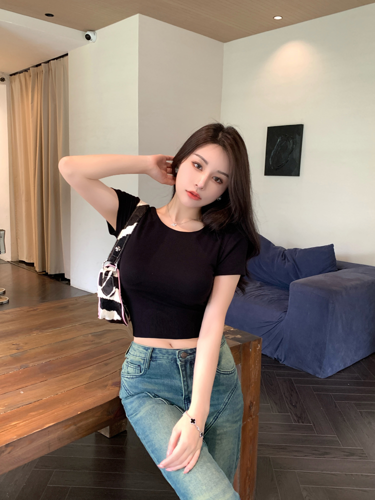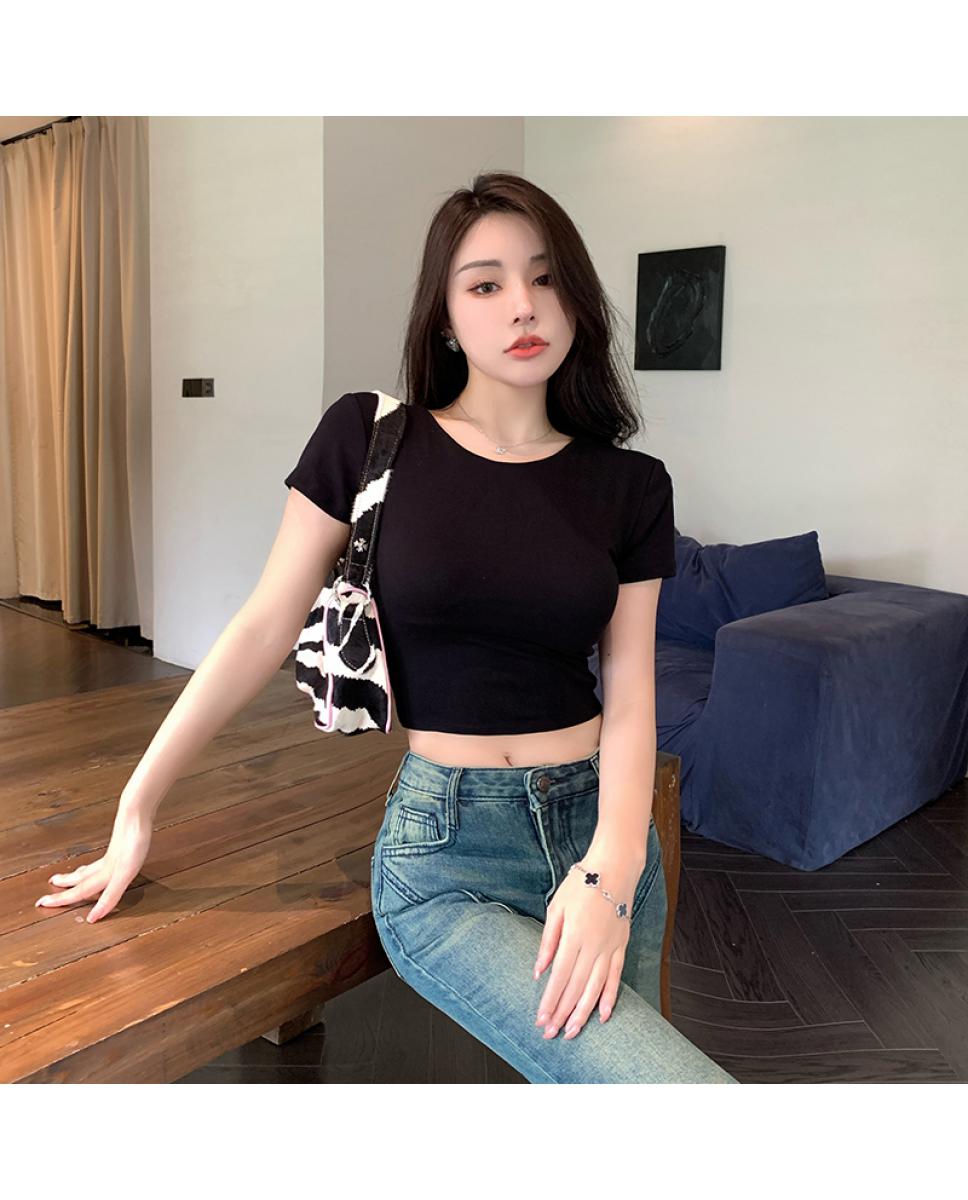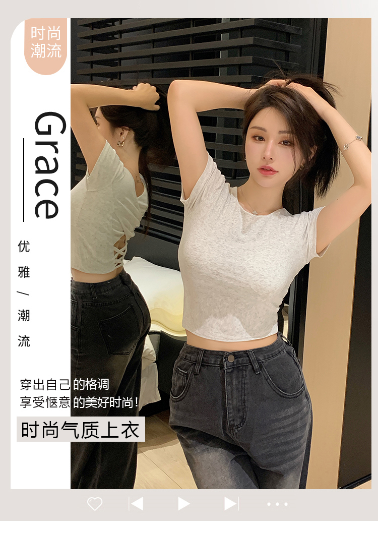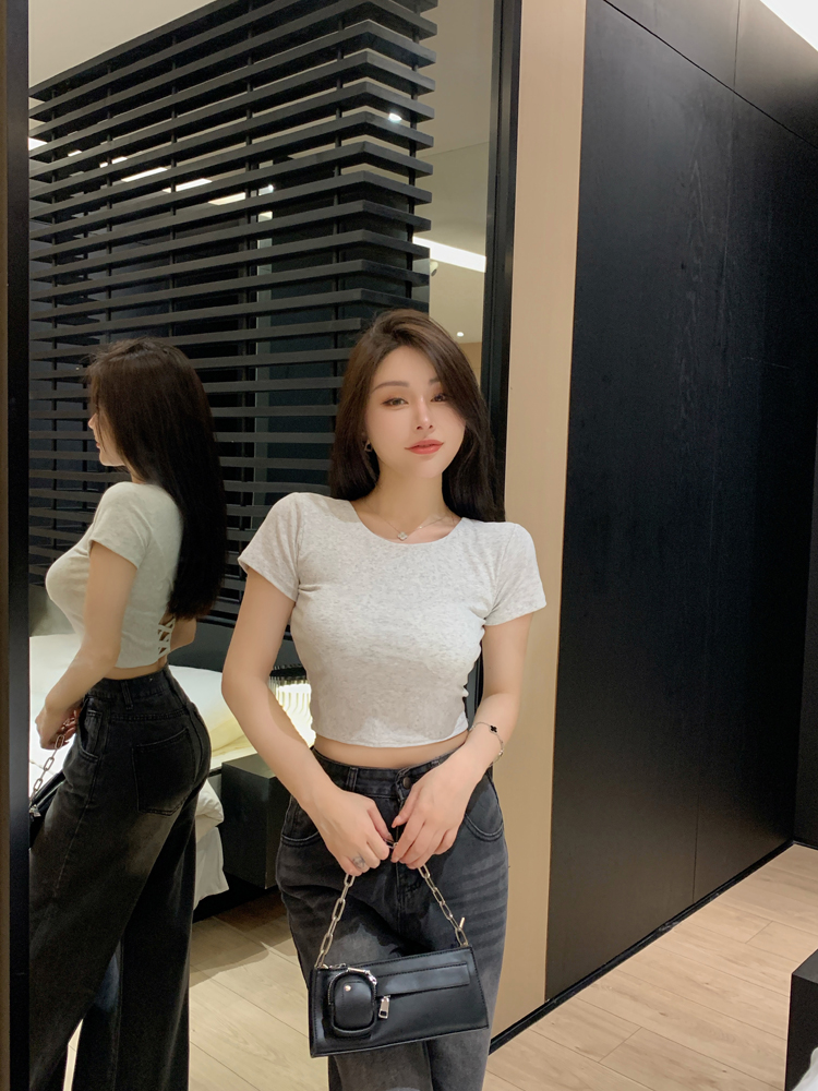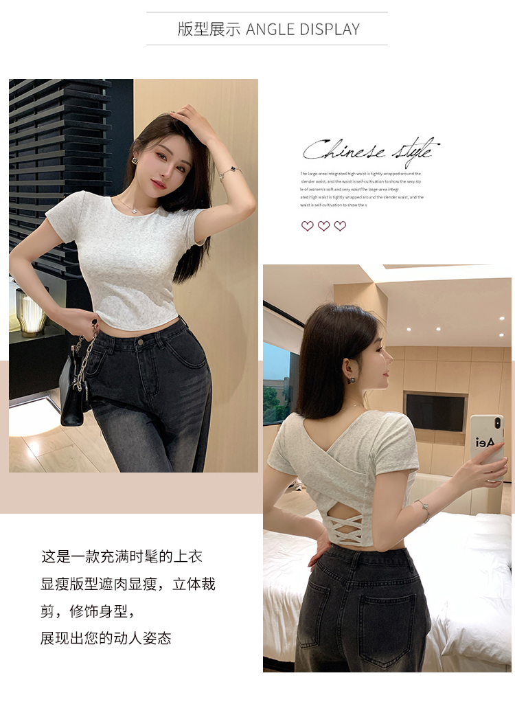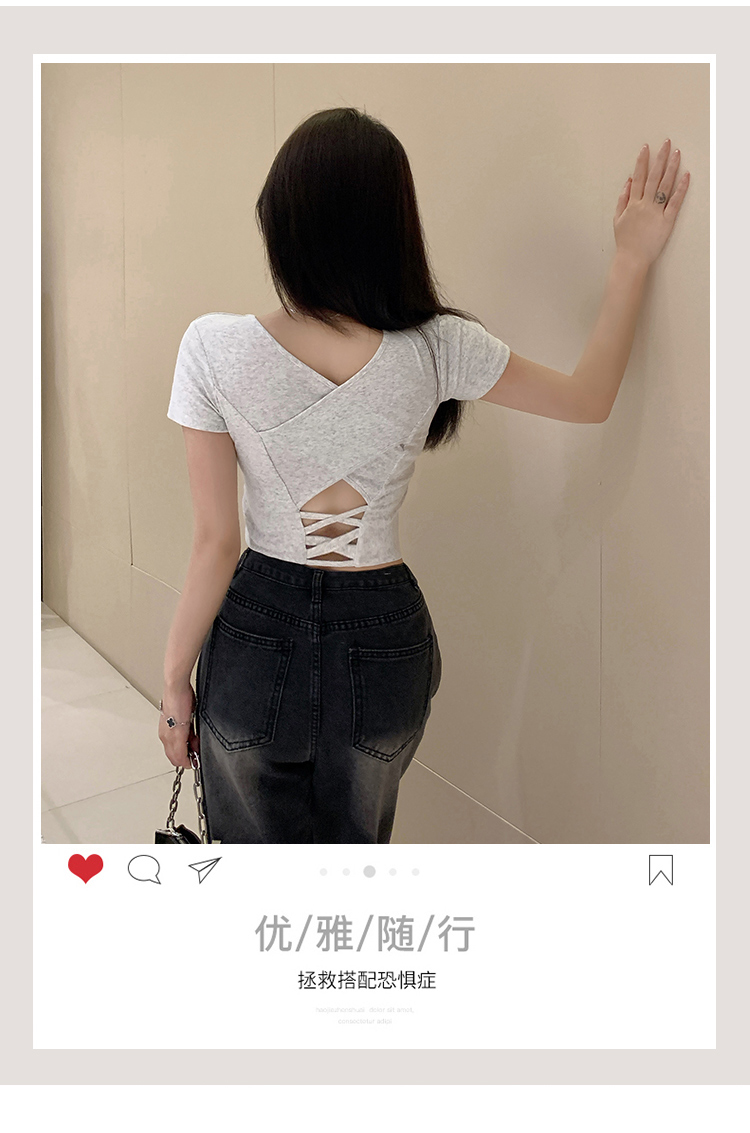 纯欲风夏季辣妹镂空美背正肩短袖T恤女小众设计显瘦短款上衣