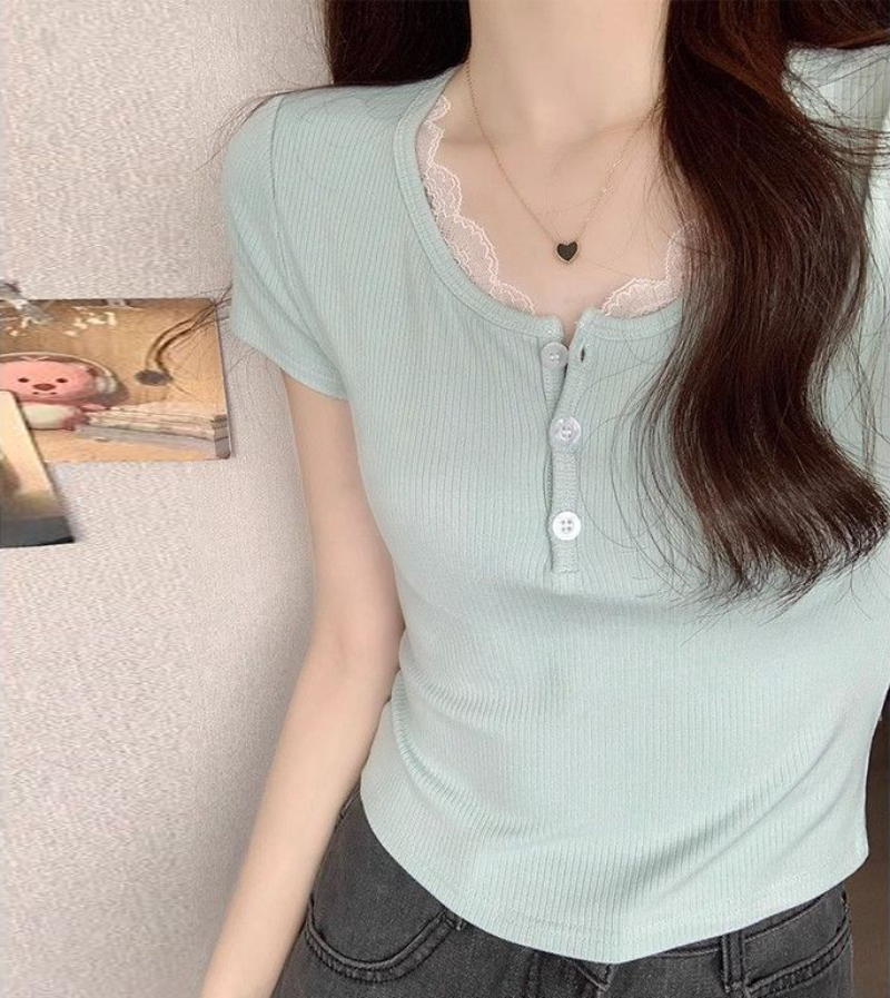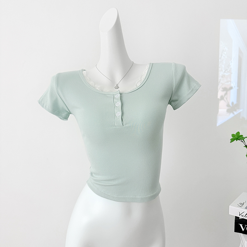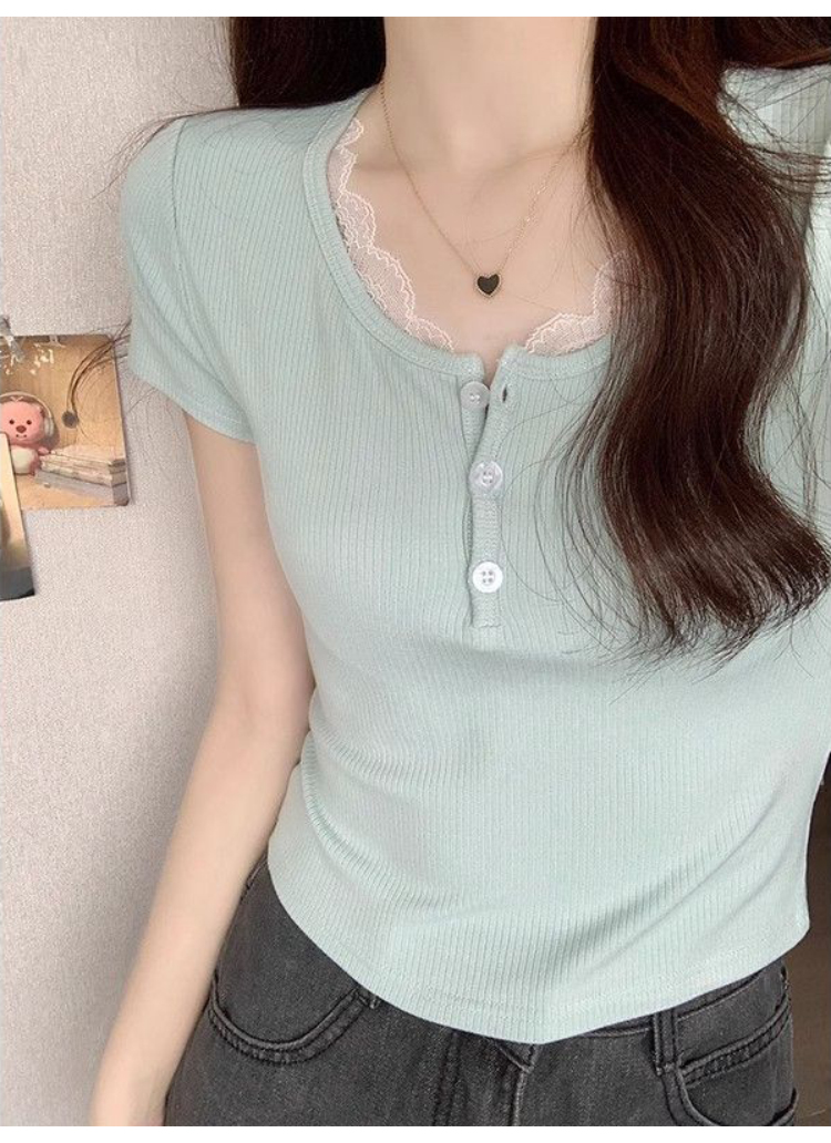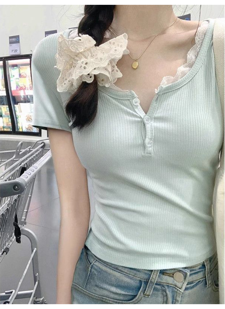 韩版夏季新款纯欲蕾丝花边拼接短袖t恤女设计感正肩短款修身上衣