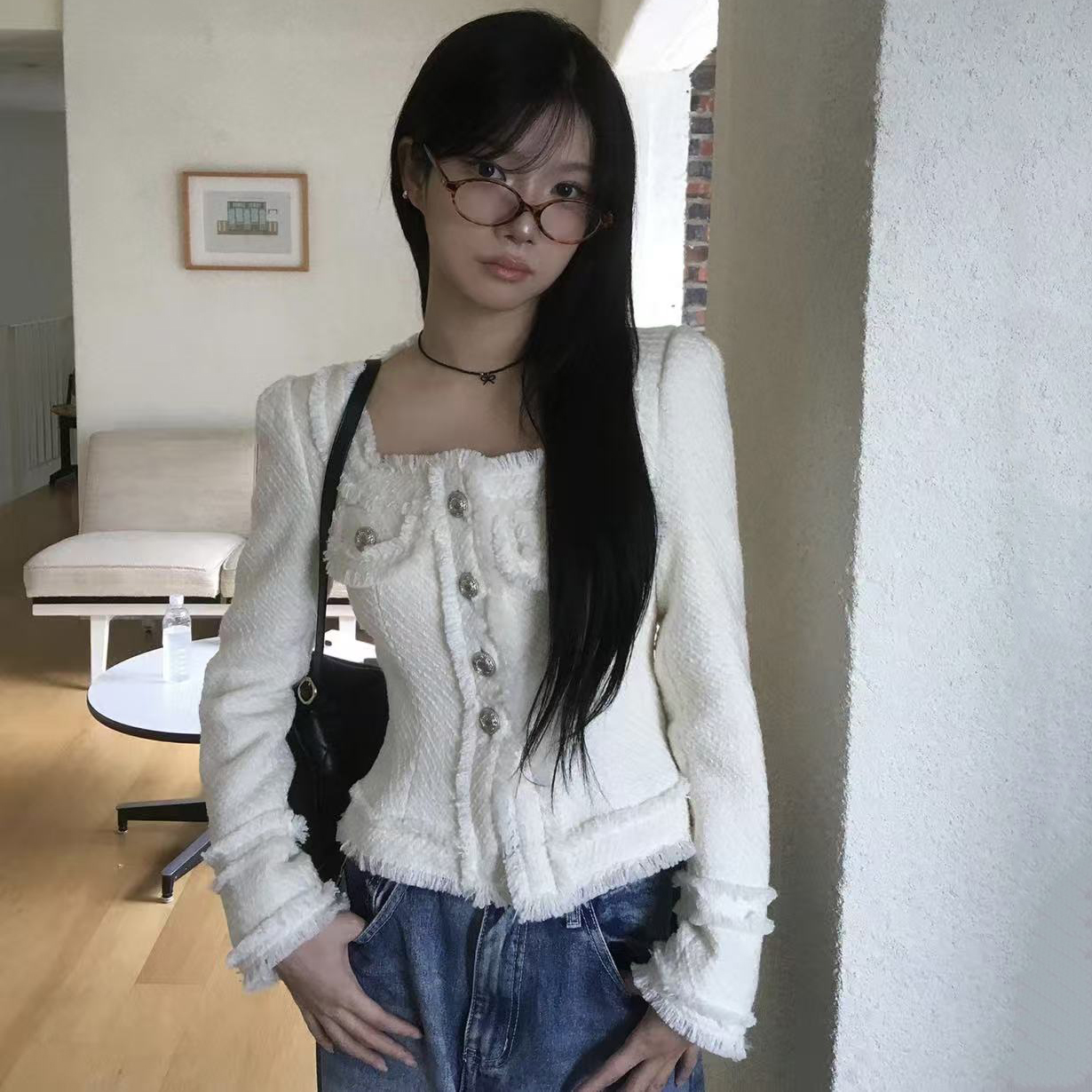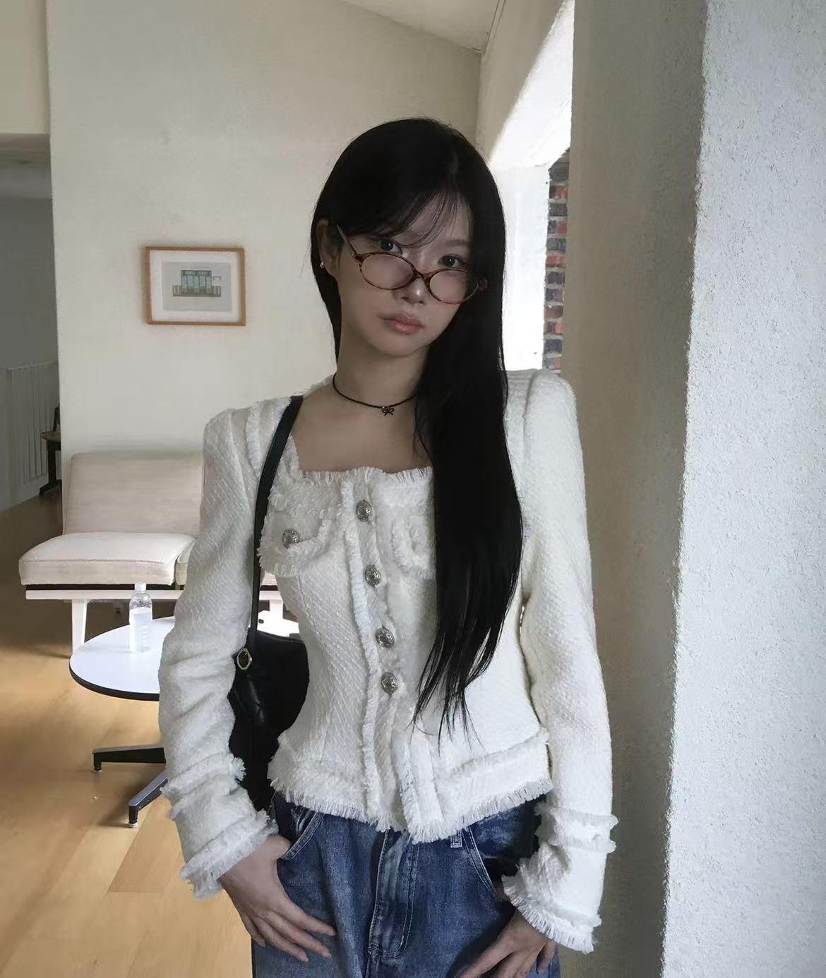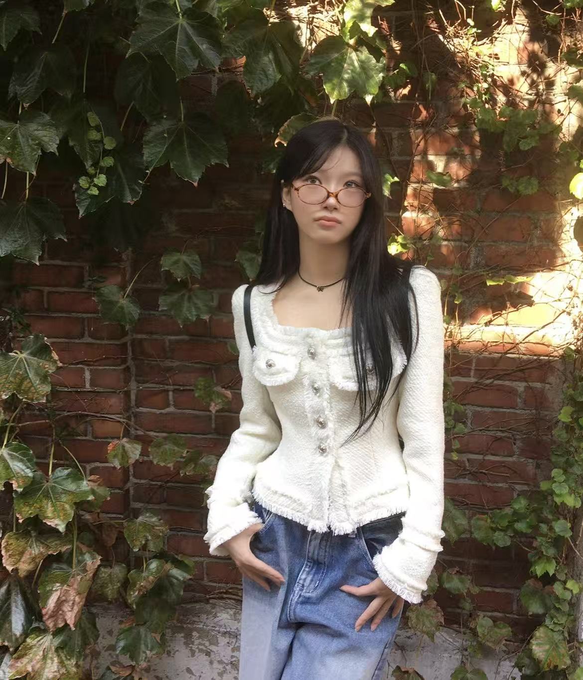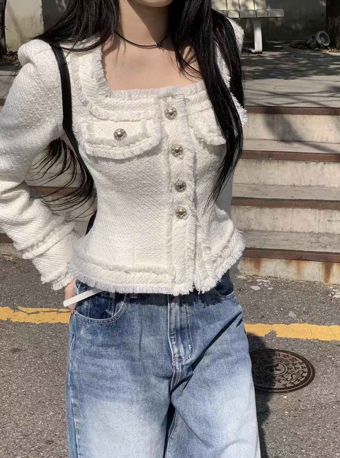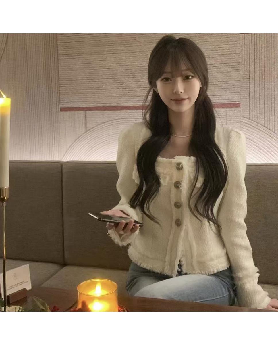 韩国chic法式气质优雅单排扣粗花呢小香风短外套