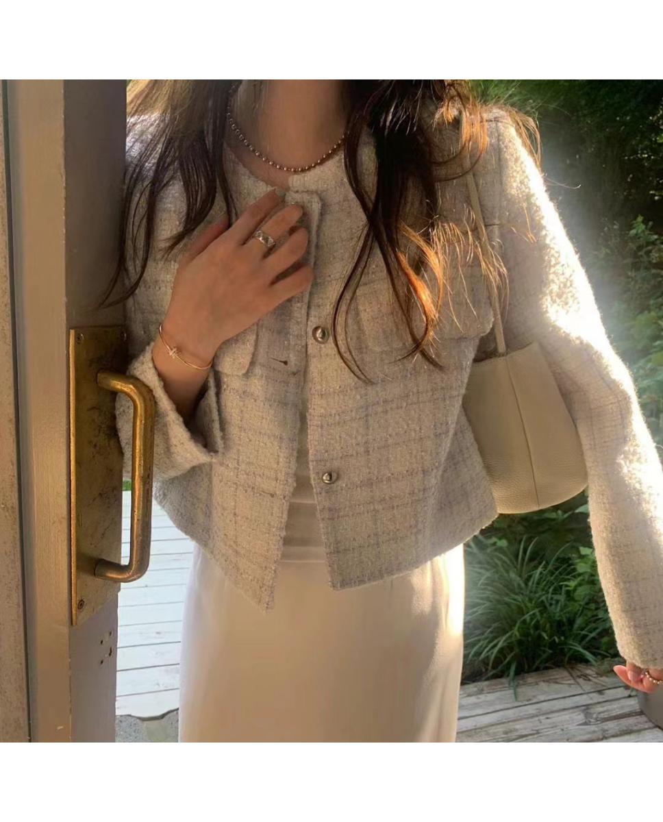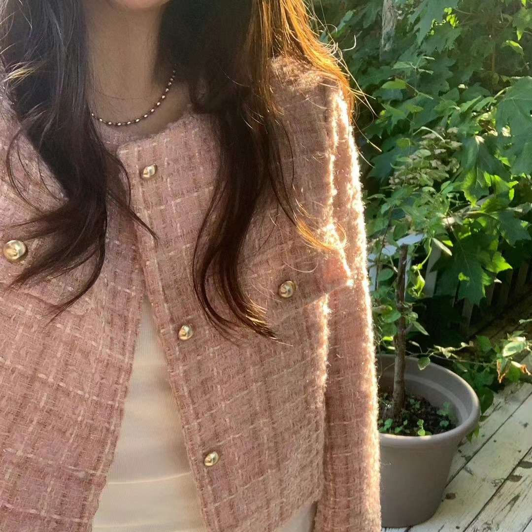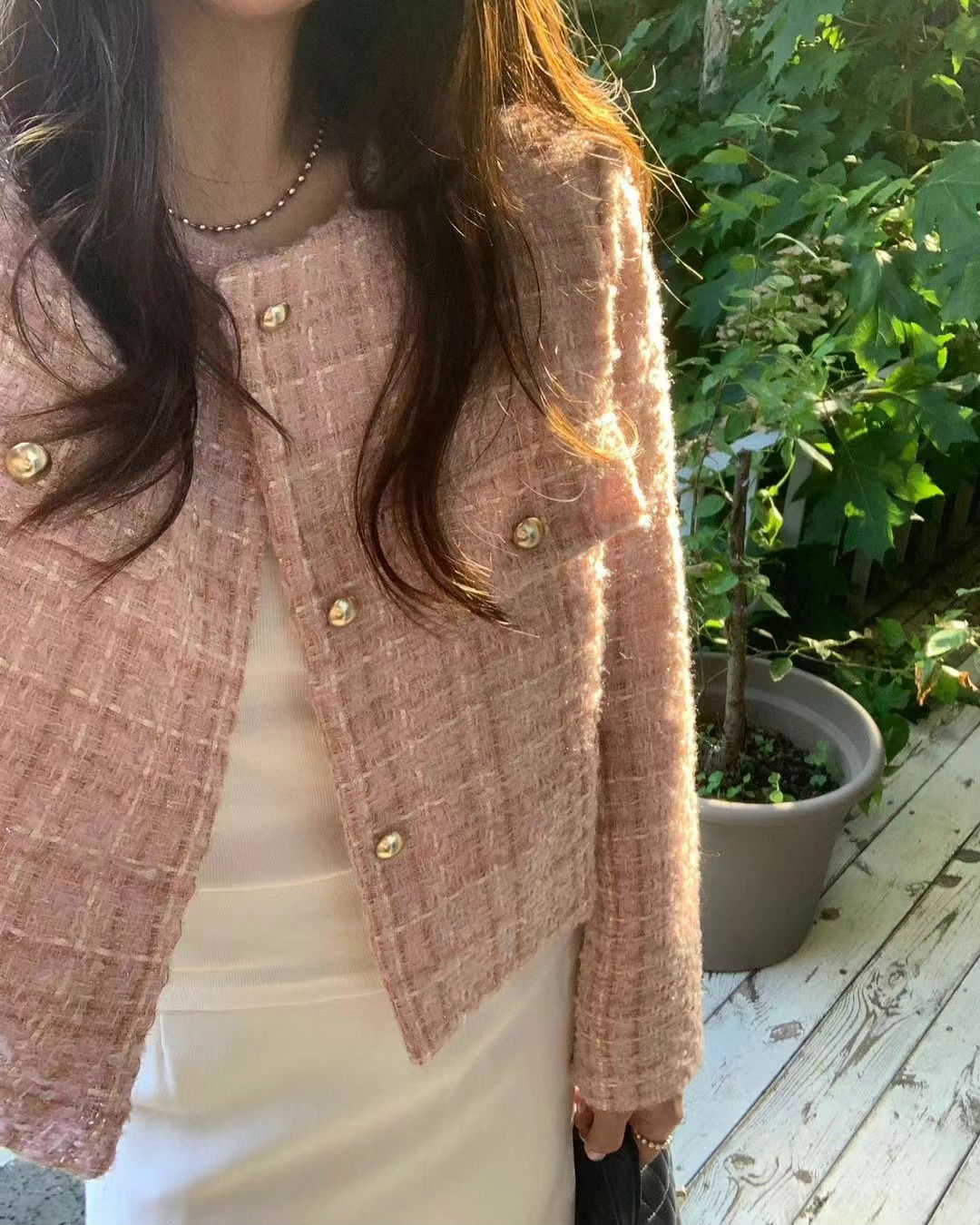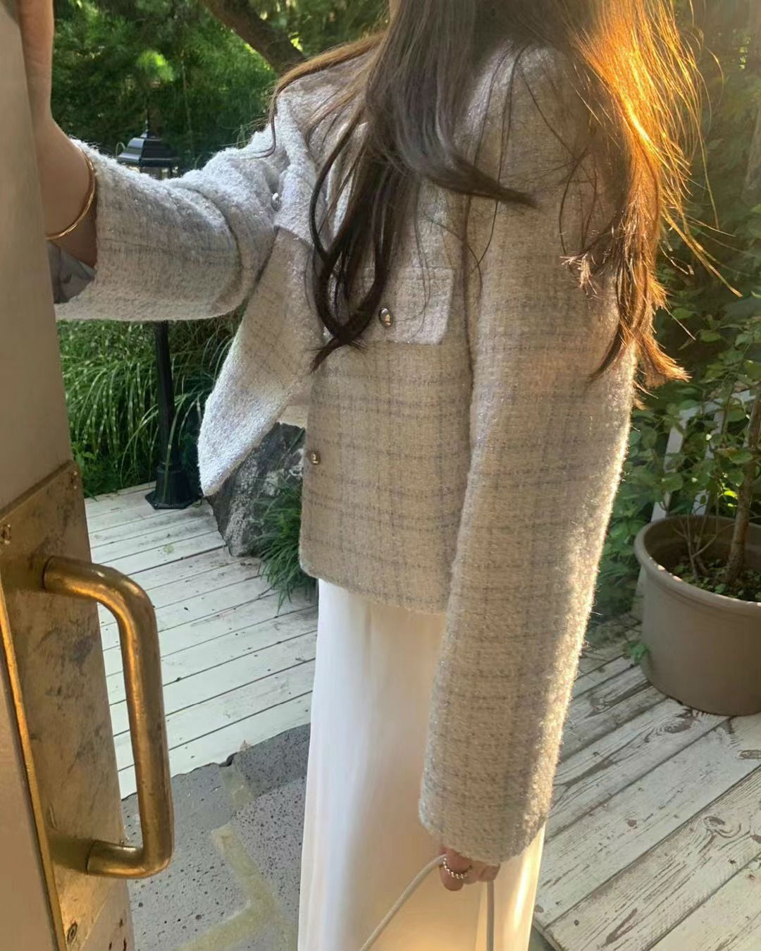 韩国chic法式气质优雅单排扣粗花呢小香风短外套