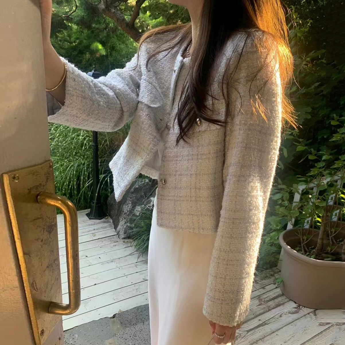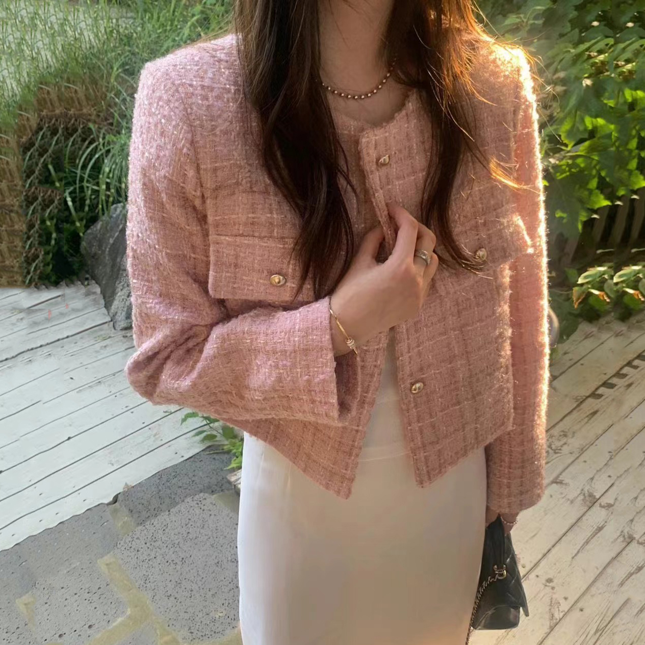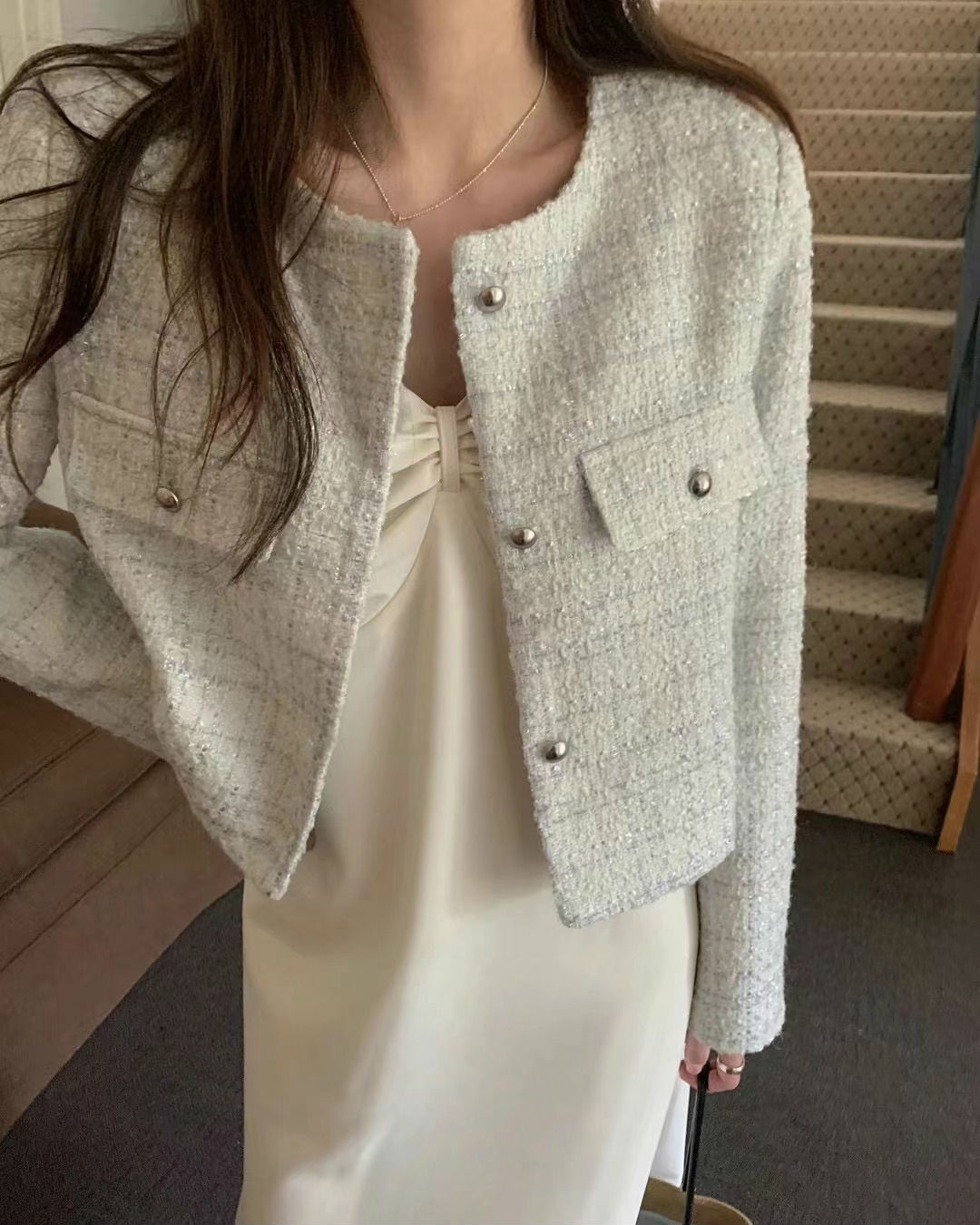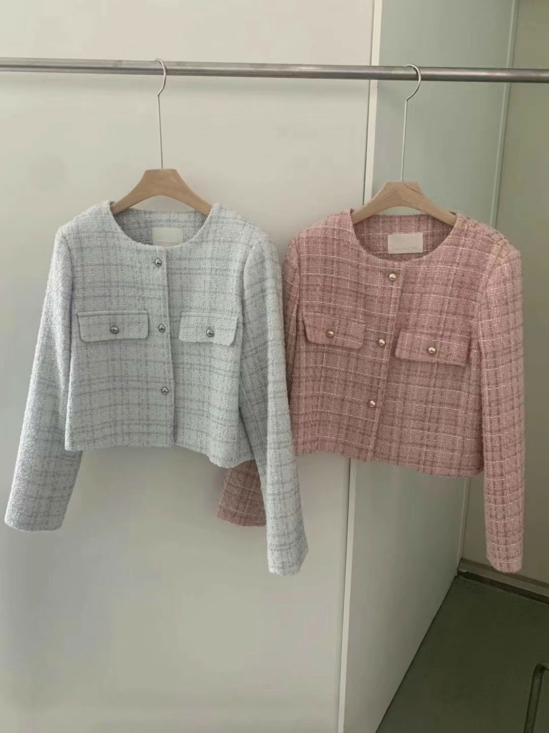 韩国chic法式气质优雅单排扣粗花呢小香风短外套