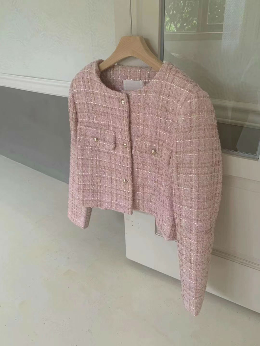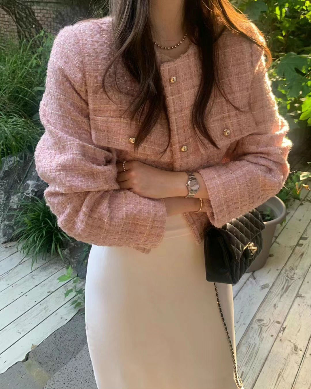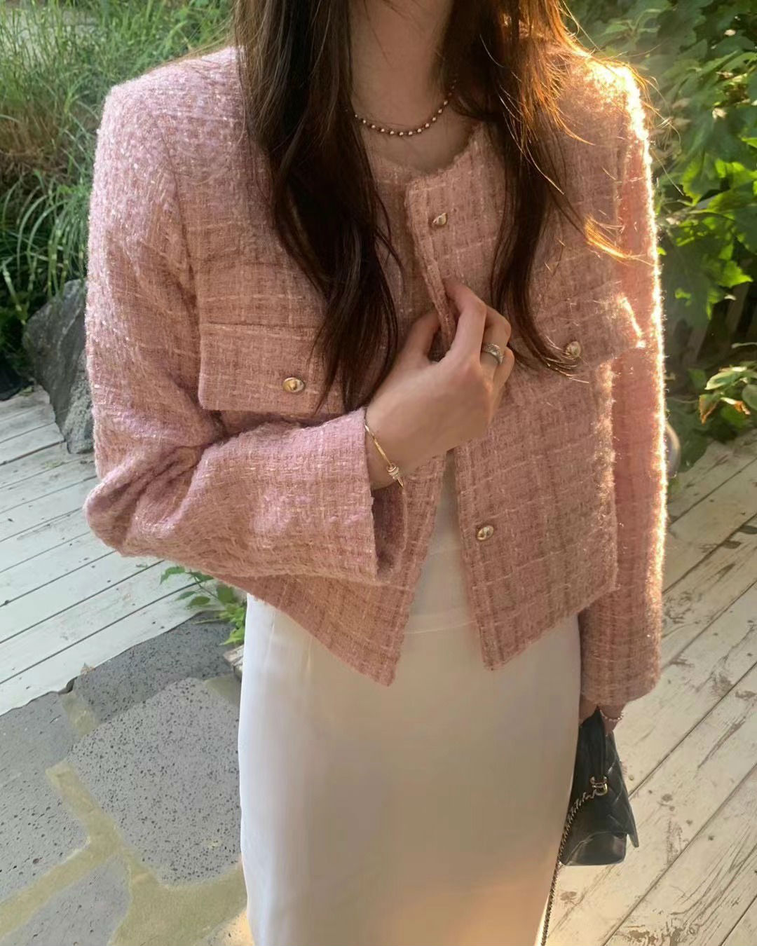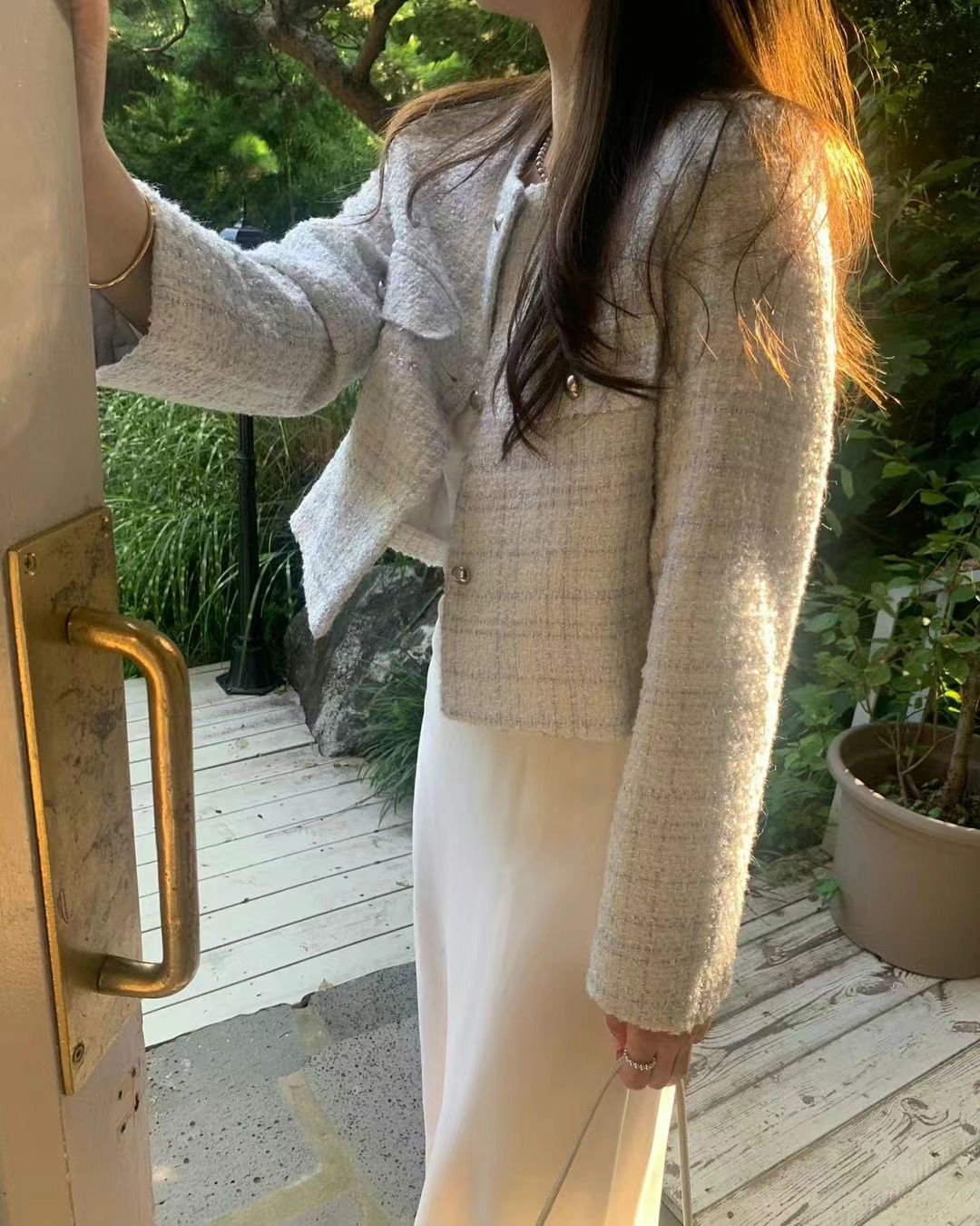 韩国chic法式气质优雅单排扣粗花呢小香风短外套
