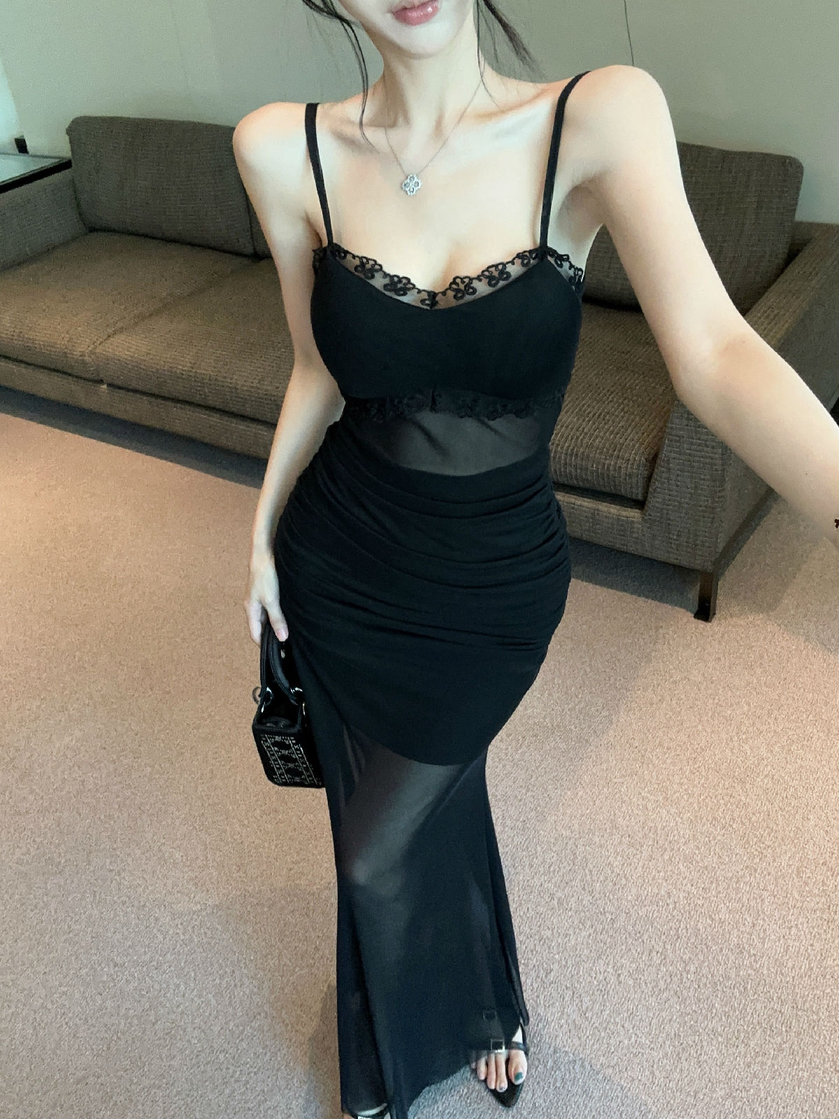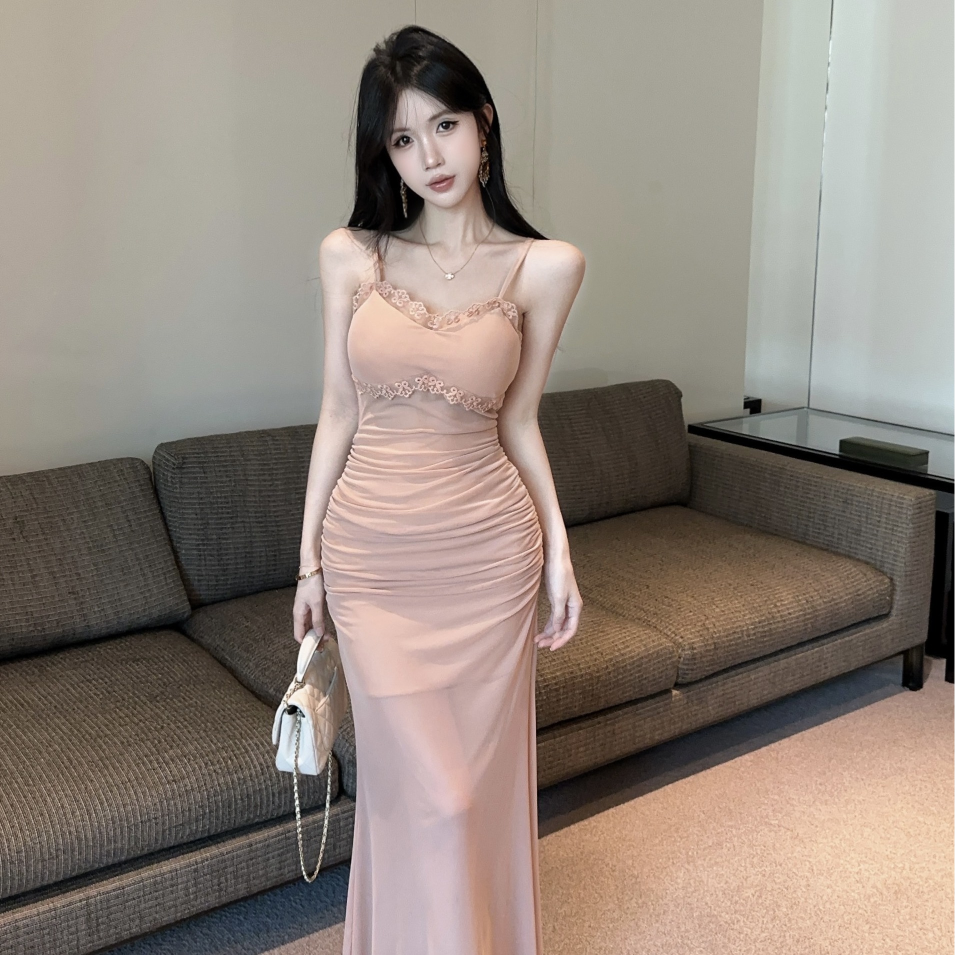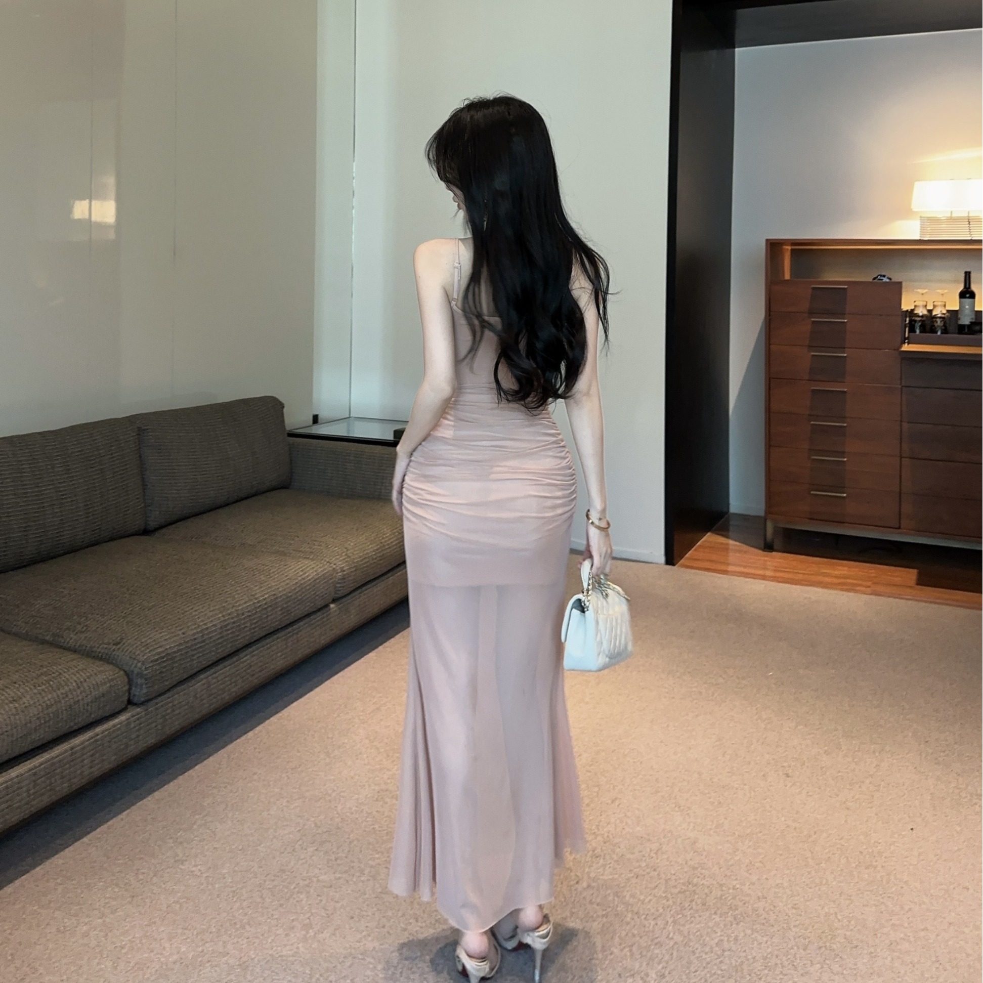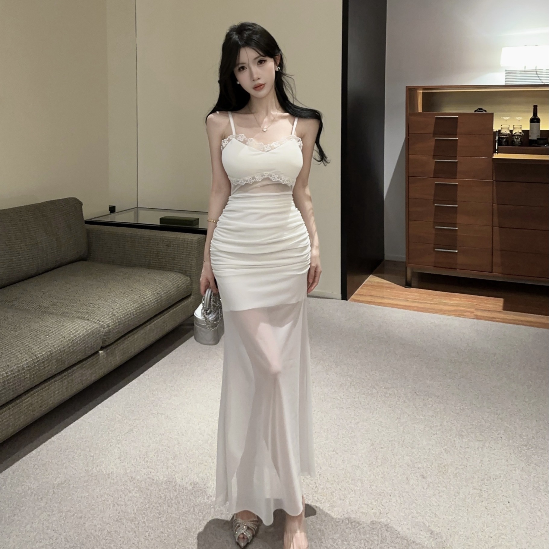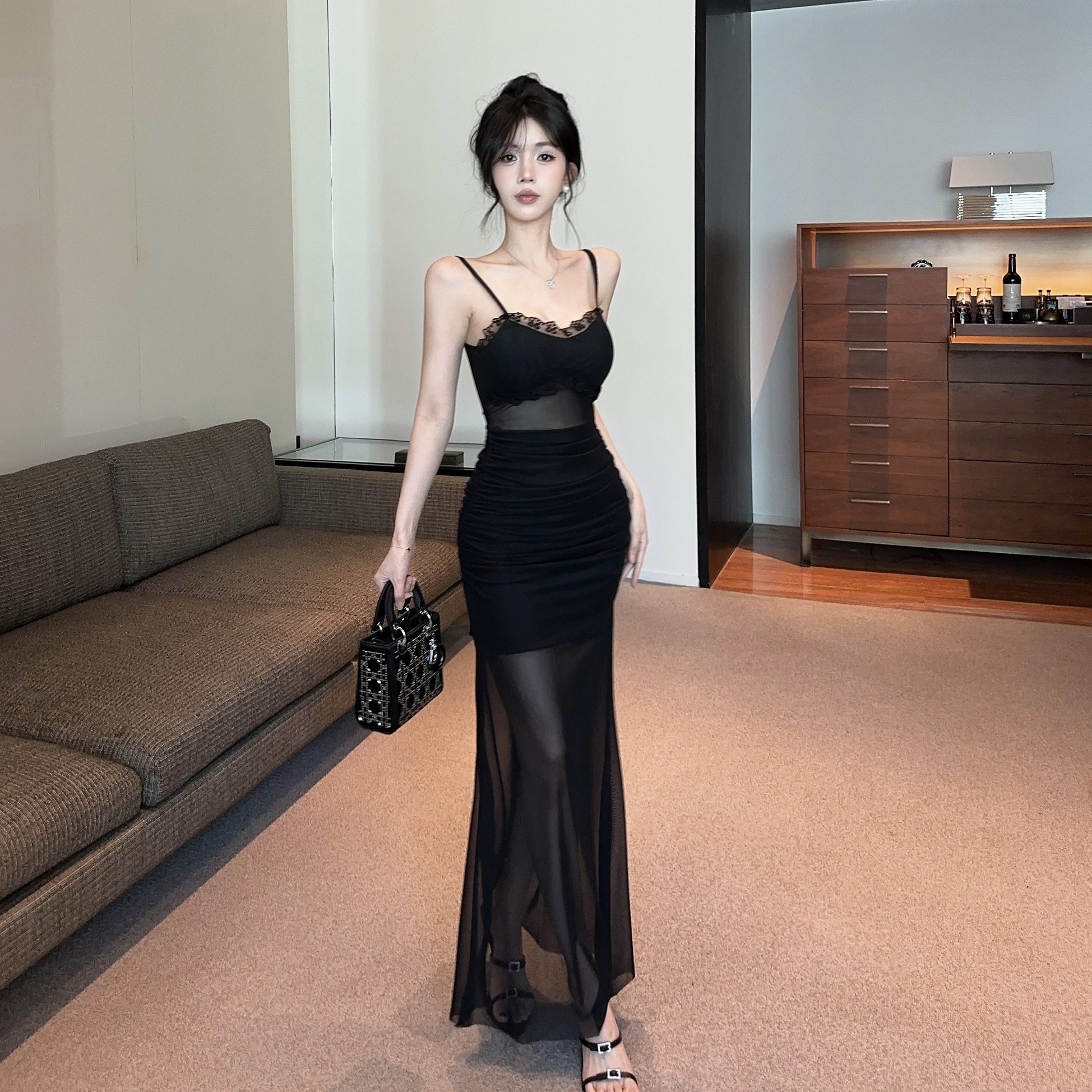 低胸露肩吊带荷叶边中长款网纱打底连衣裙