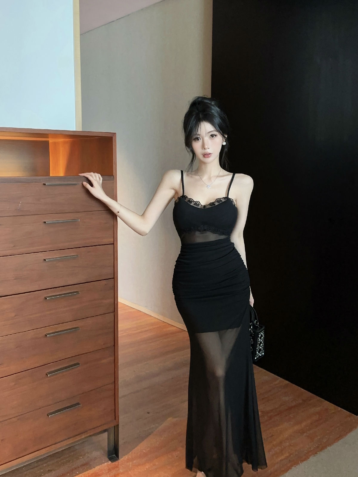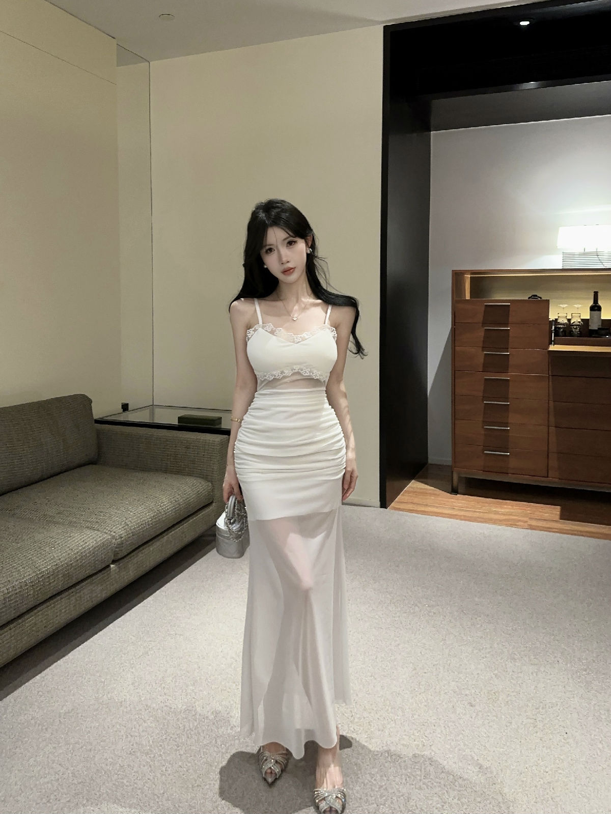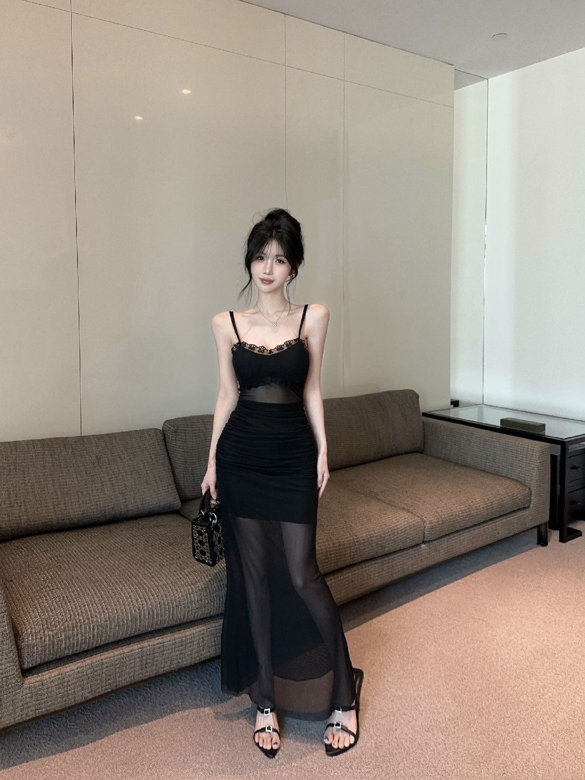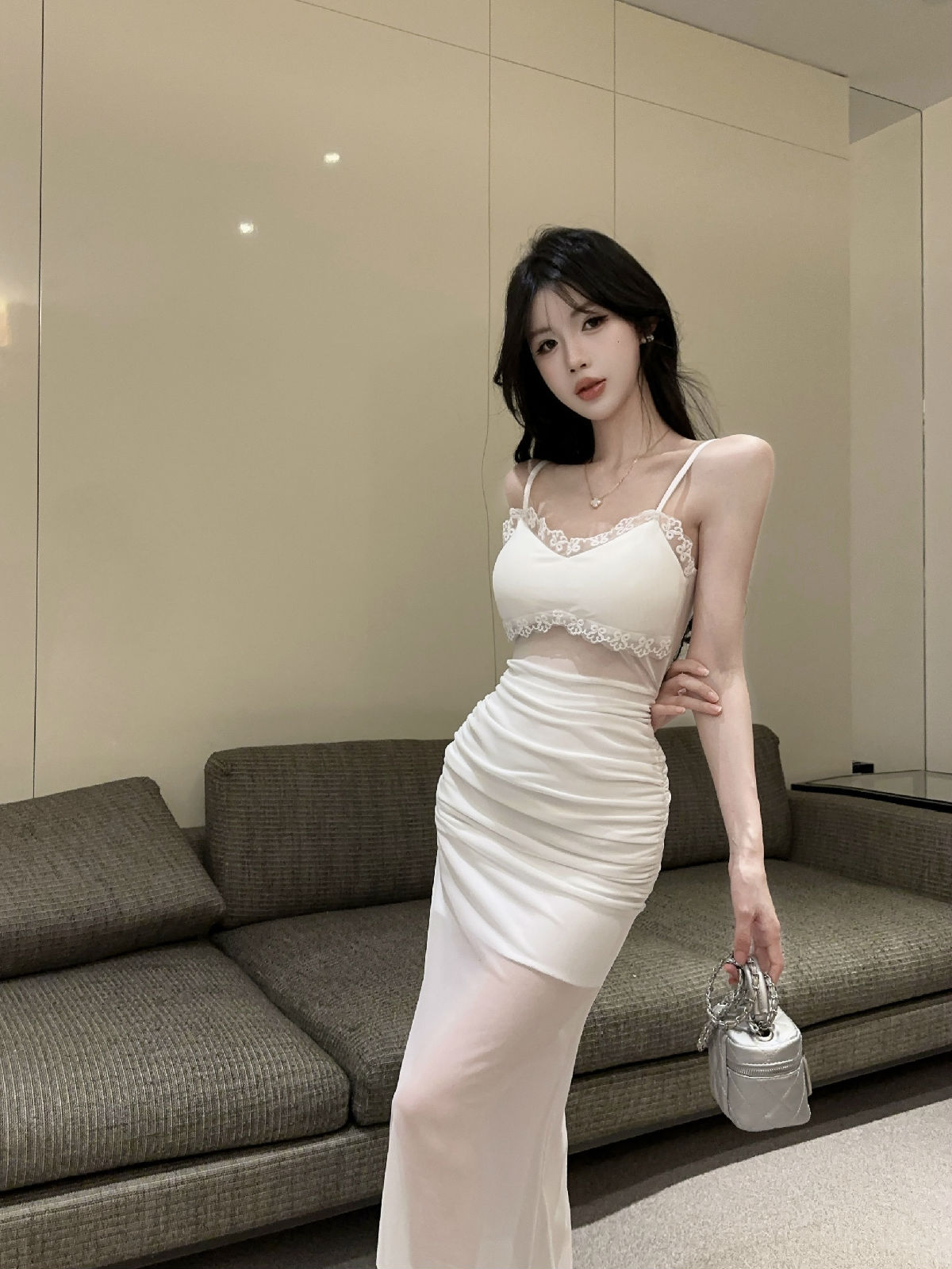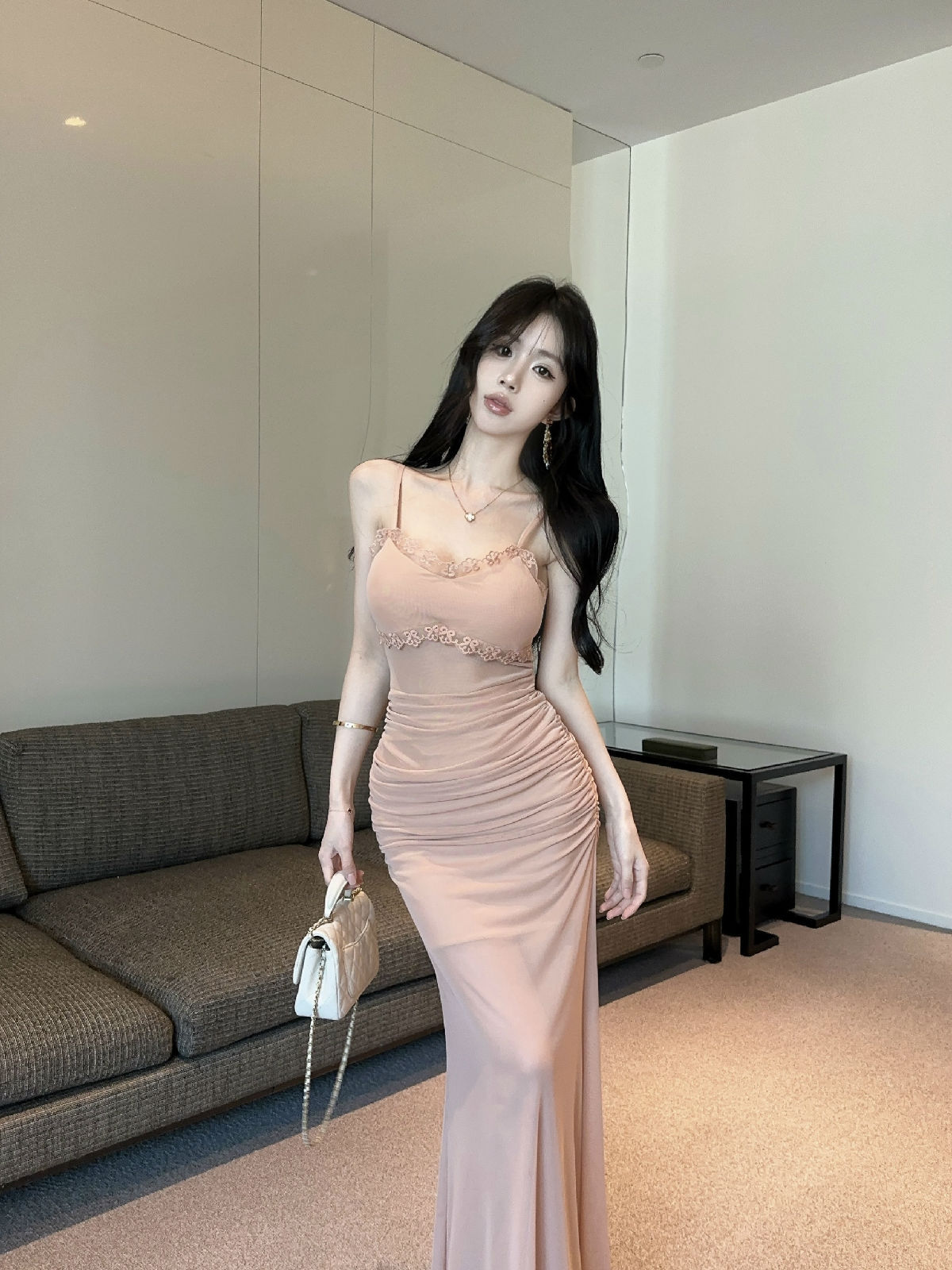 低胸露肩吊带荷叶边中长款网纱打底连衣裙