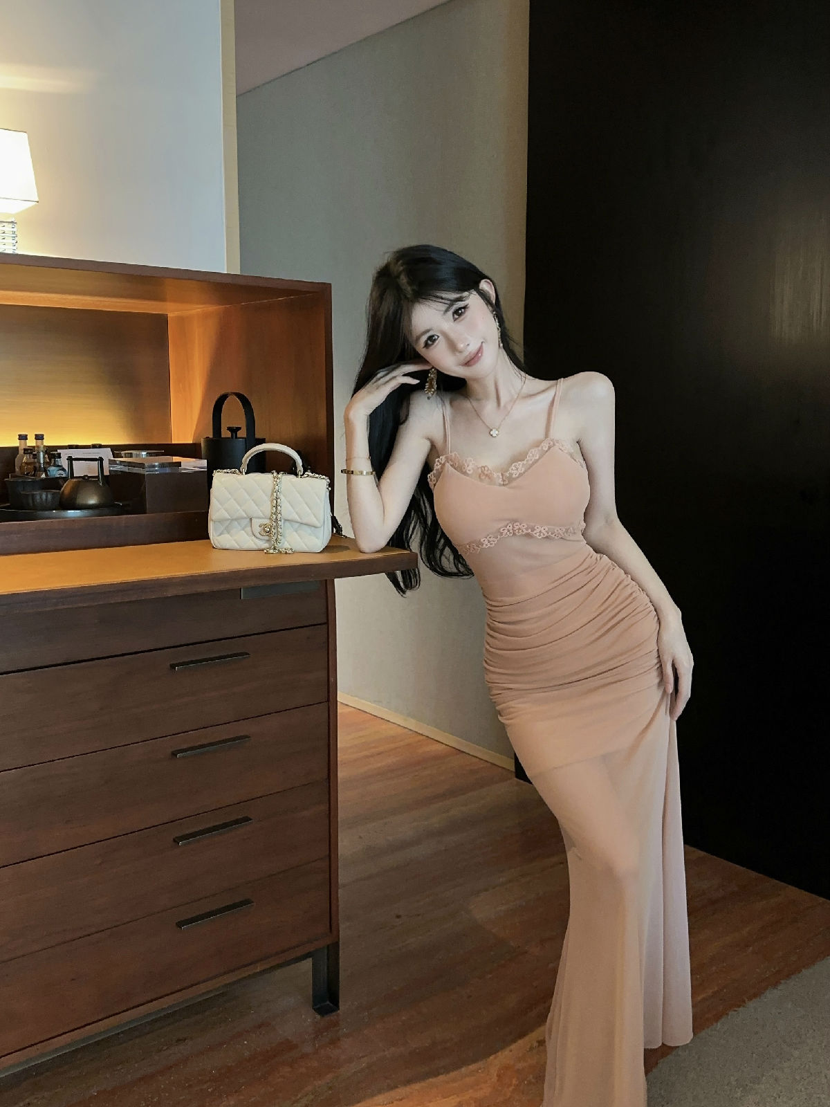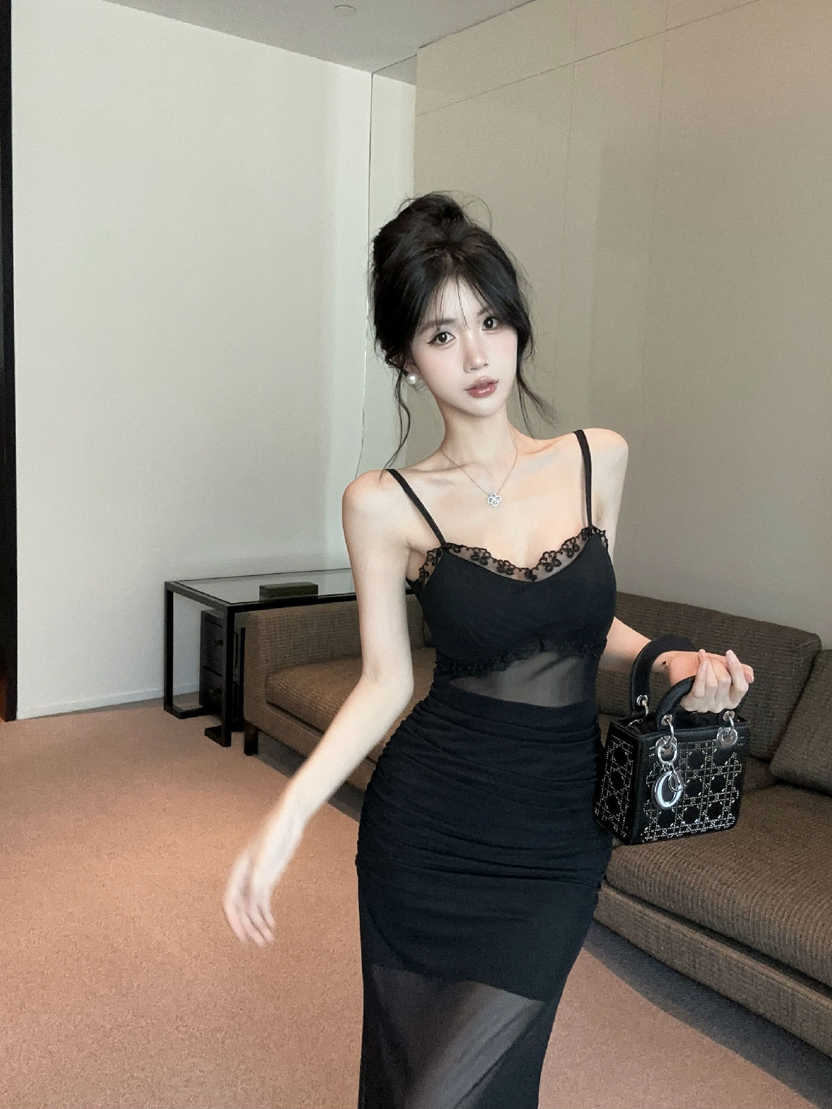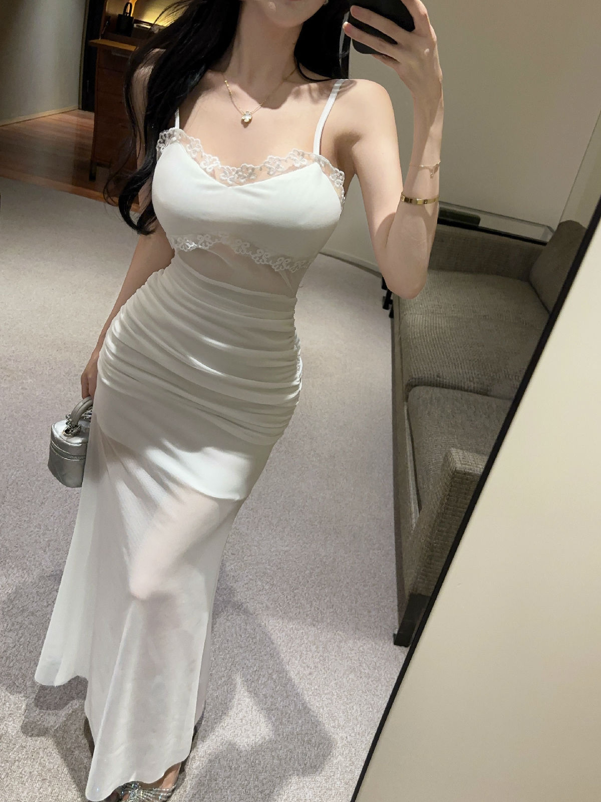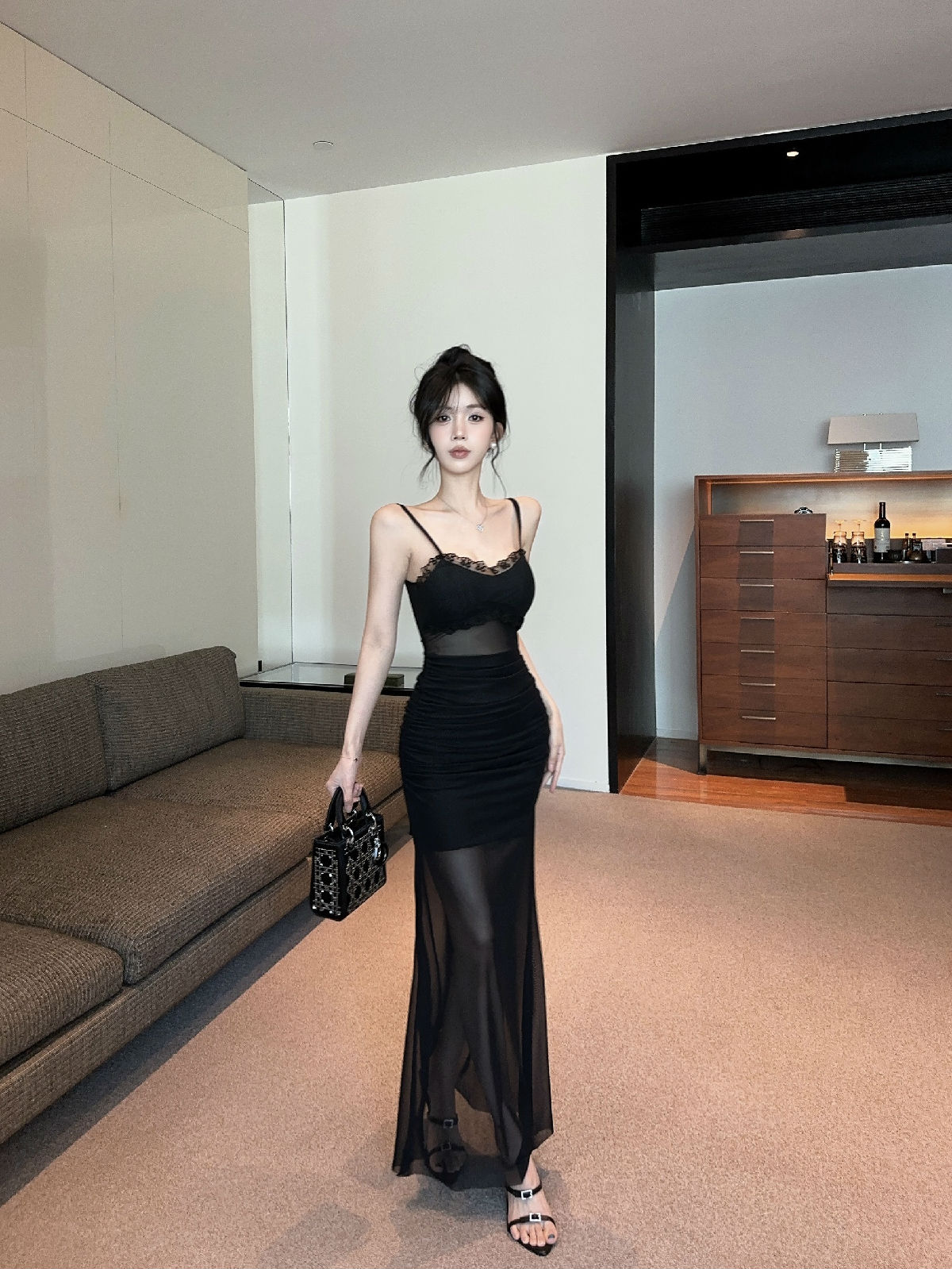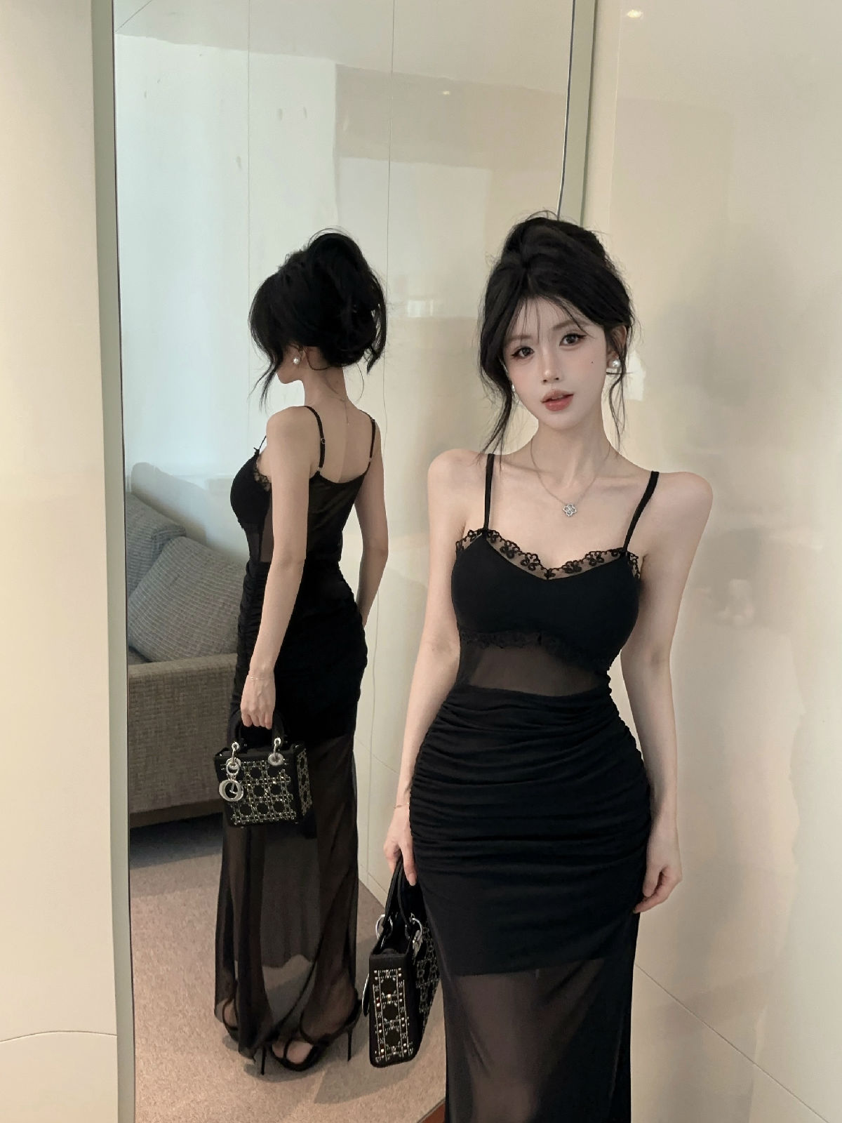 低胸露肩吊带荷叶边中长款网纱打底连衣裙