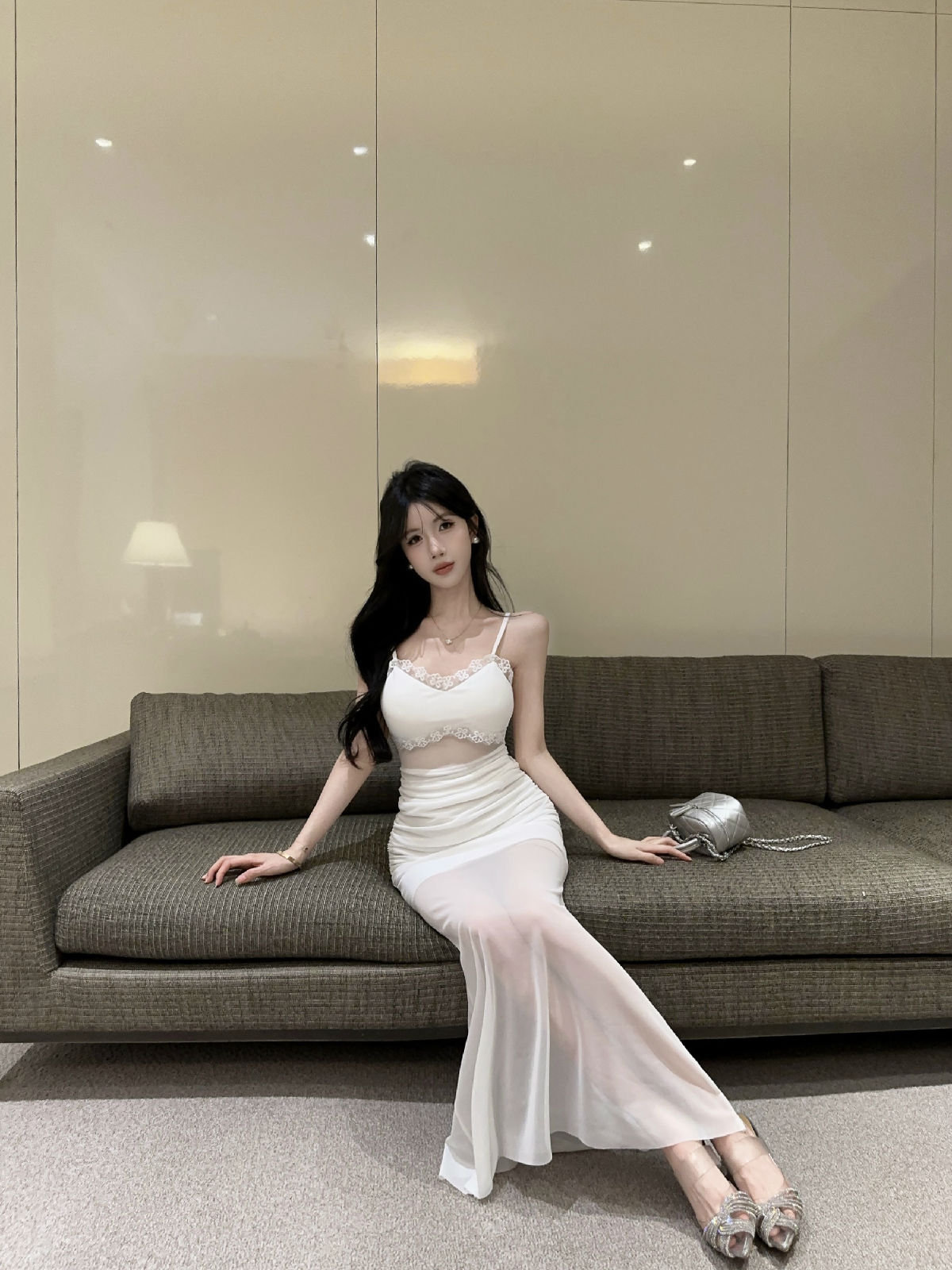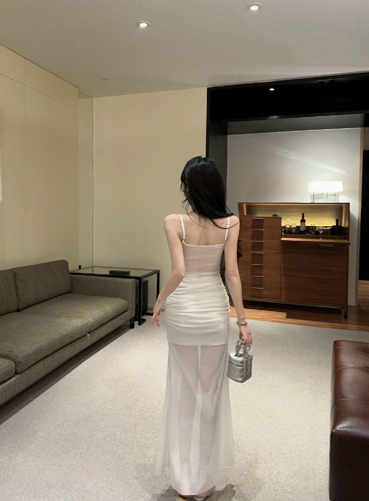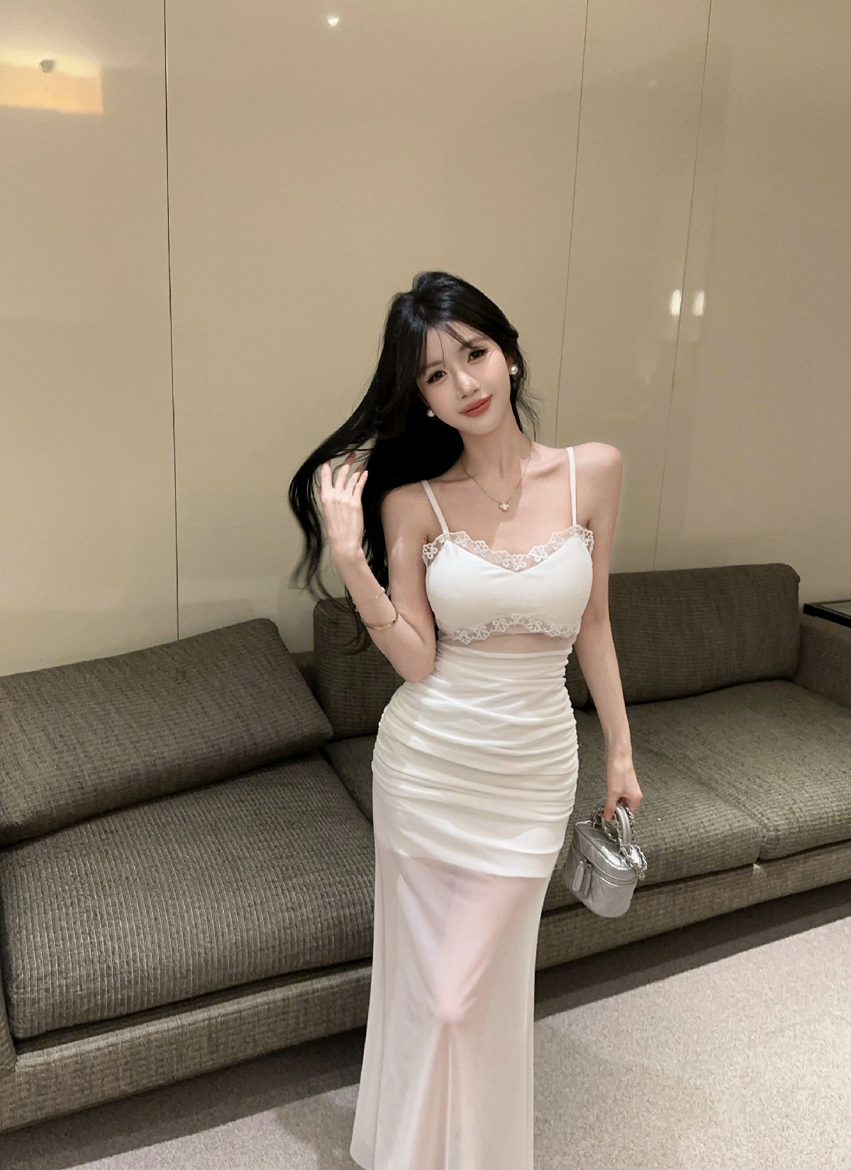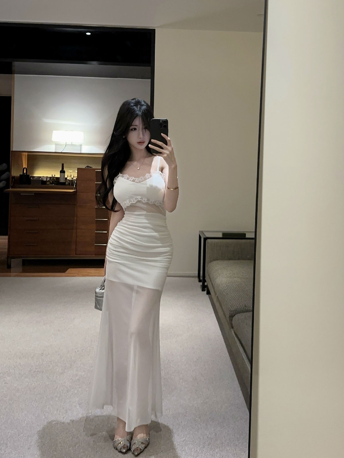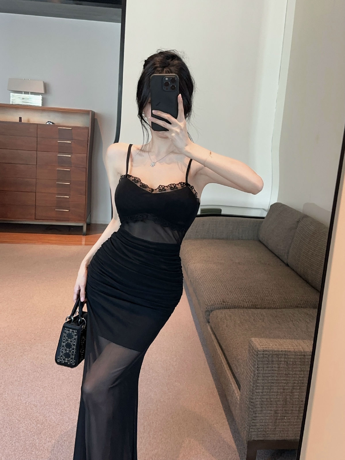 低胸露肩吊带荷叶边中长款网纱打底连衣裙