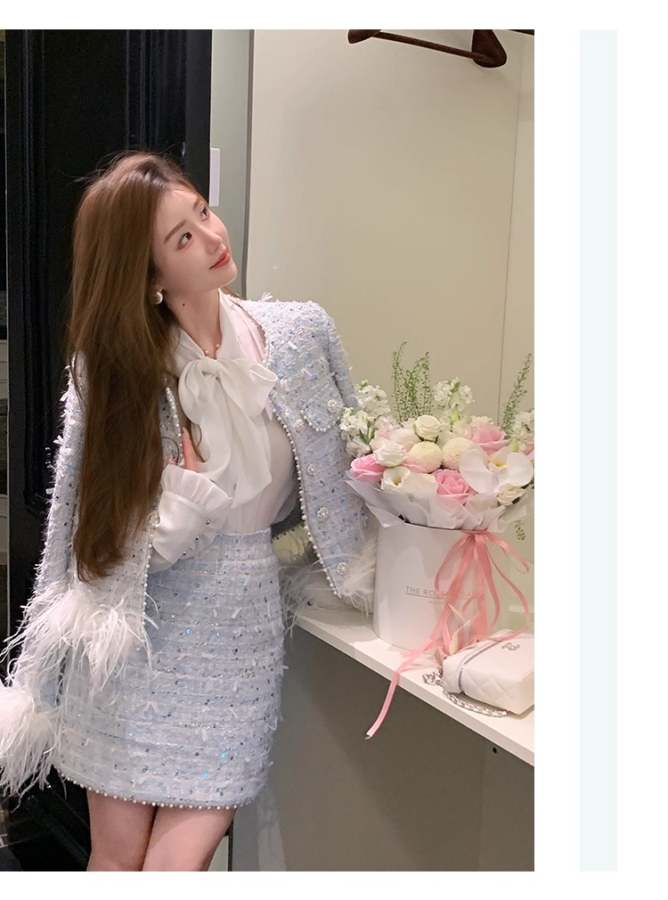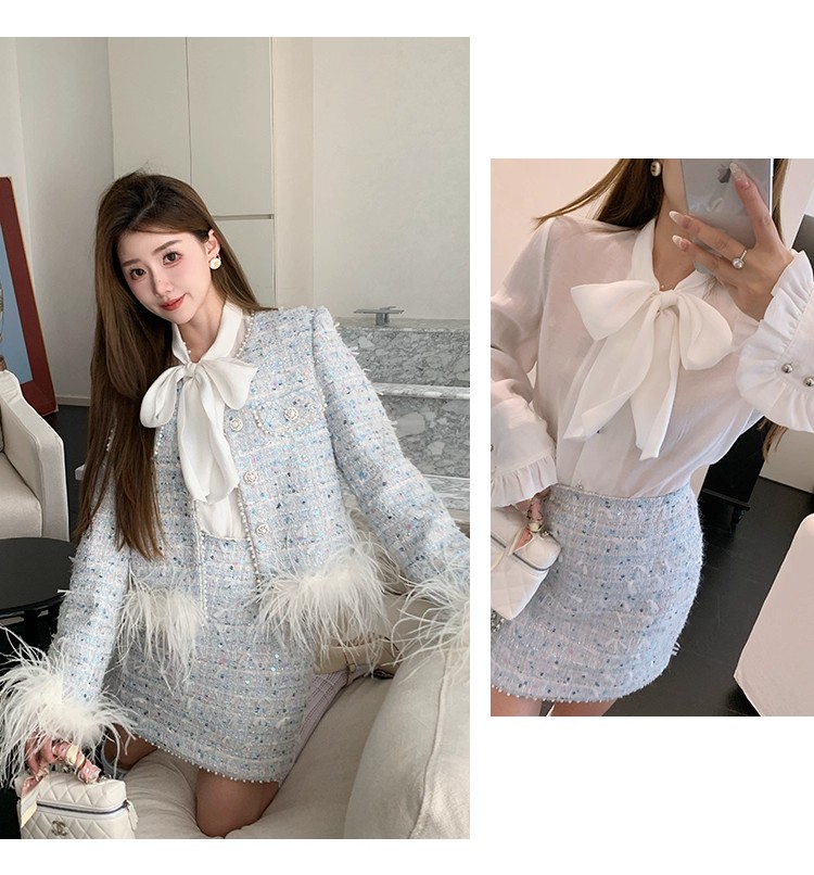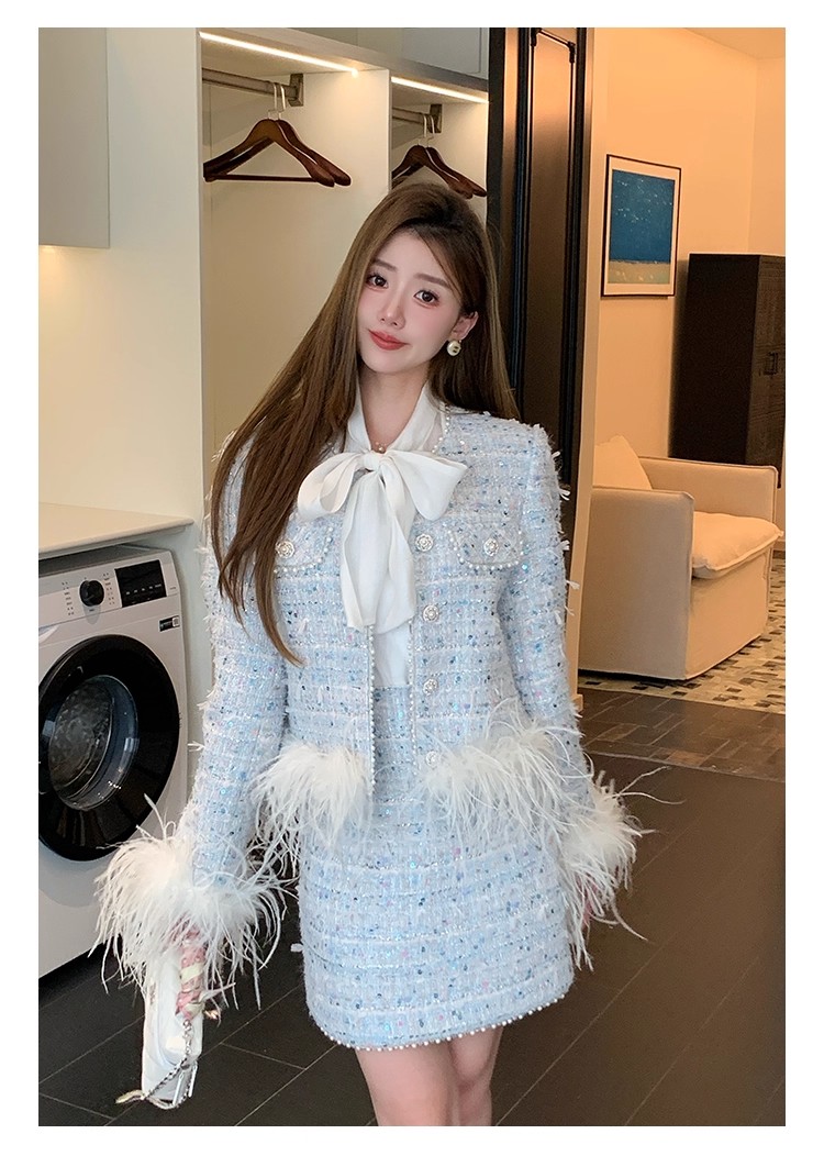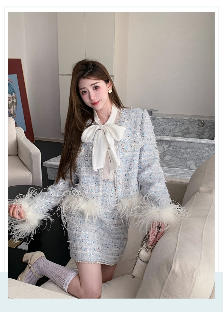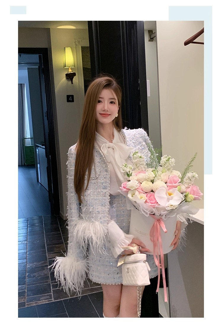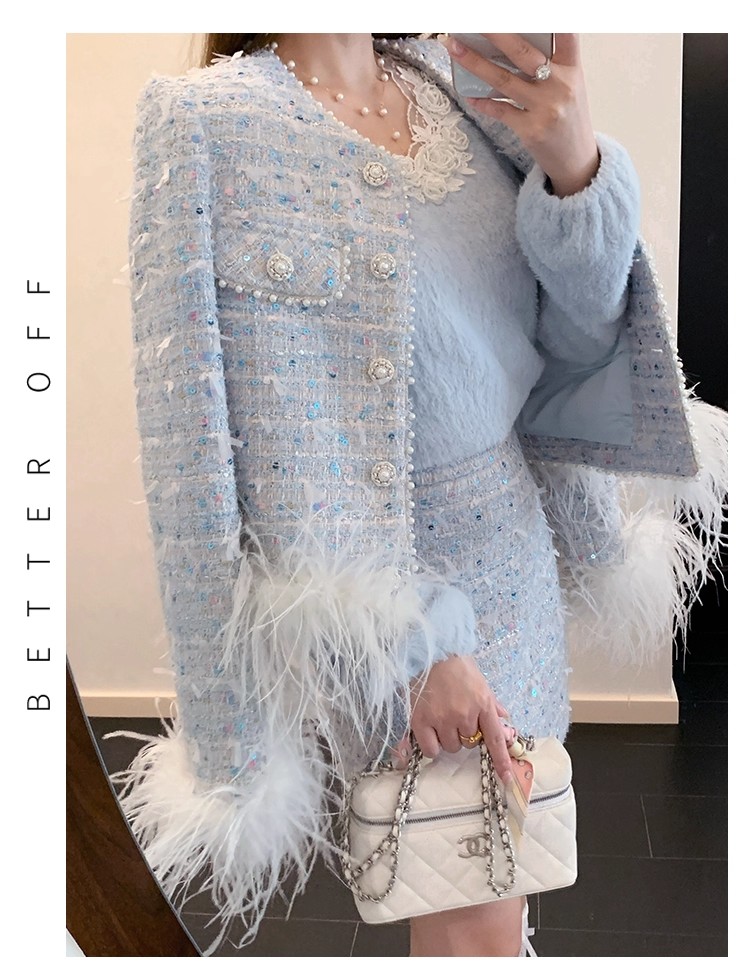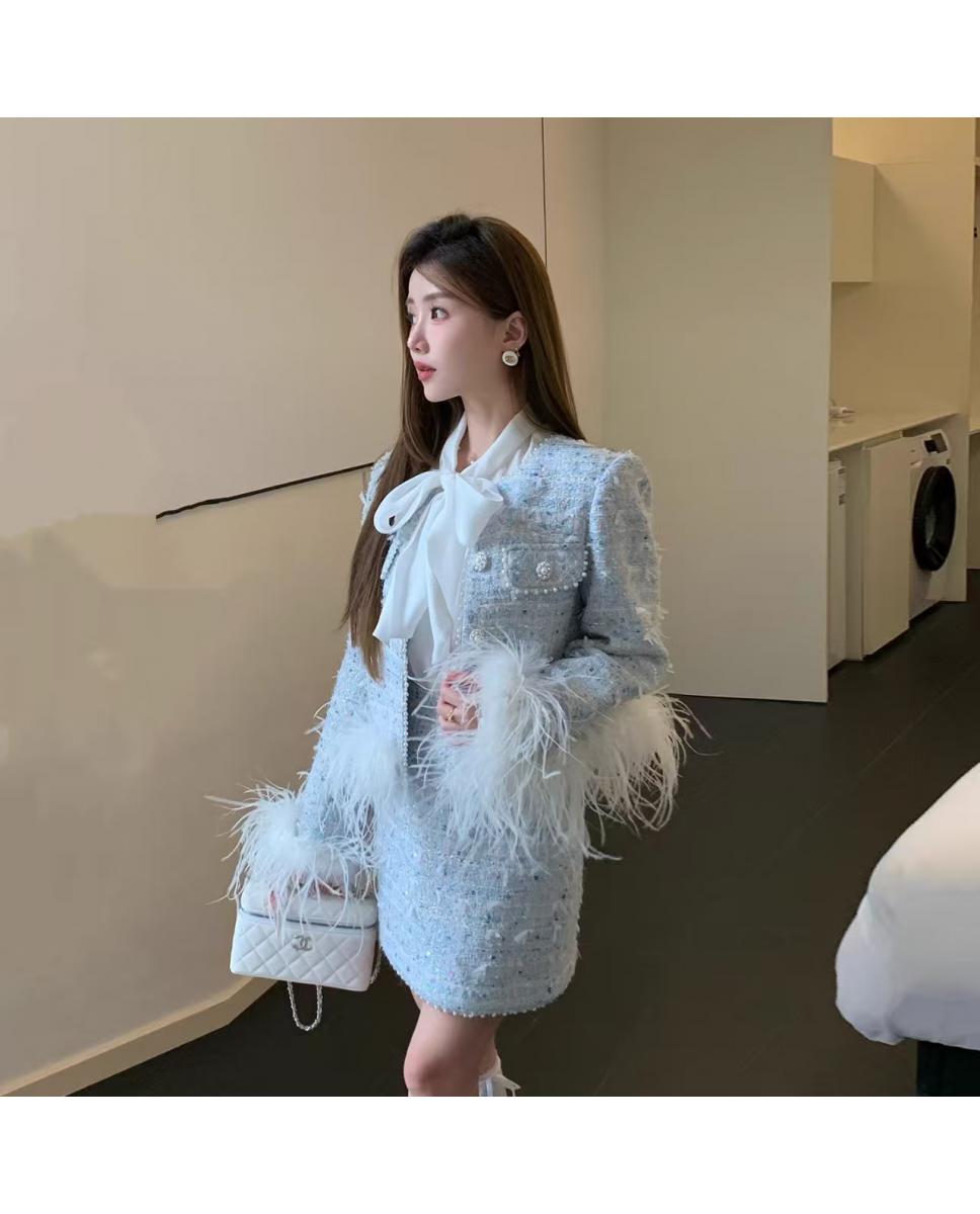 新款春秋法式名媛风鸵鸟毛小香外套高腰短裙套装