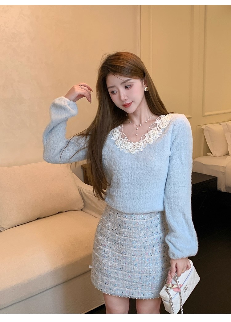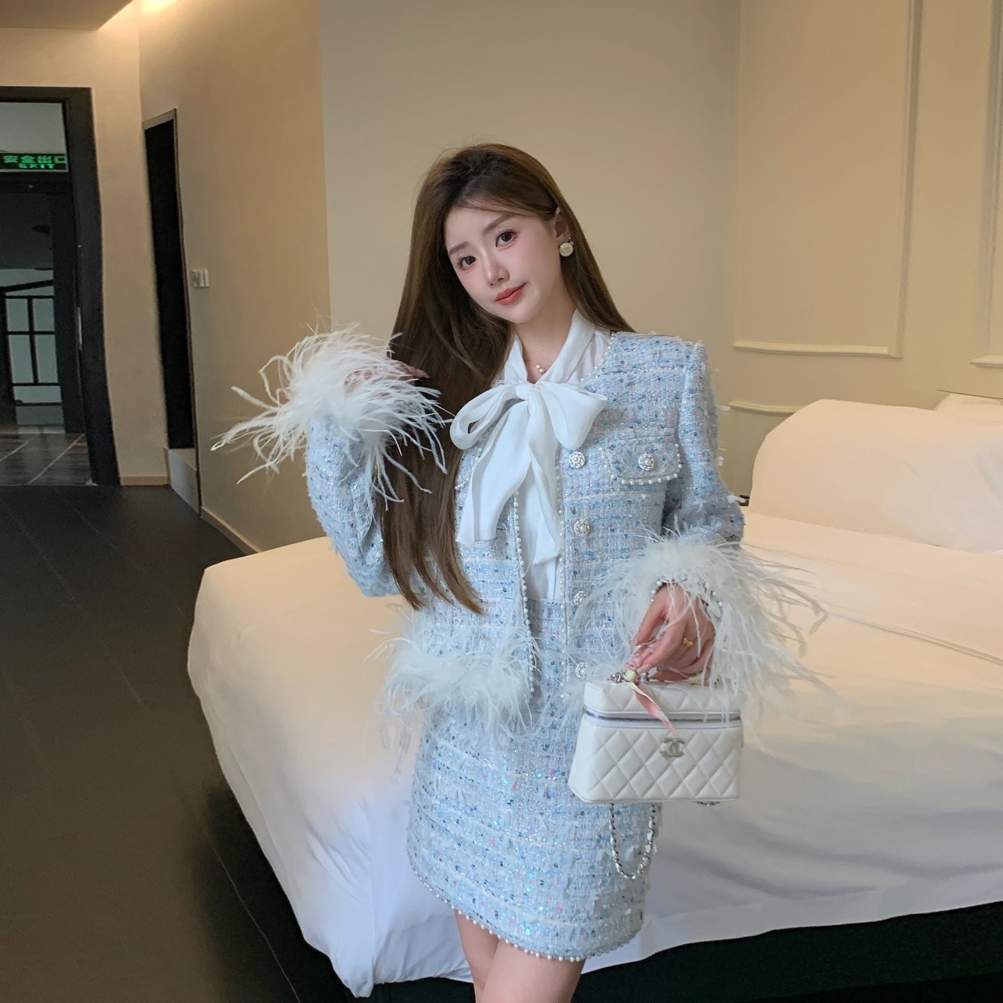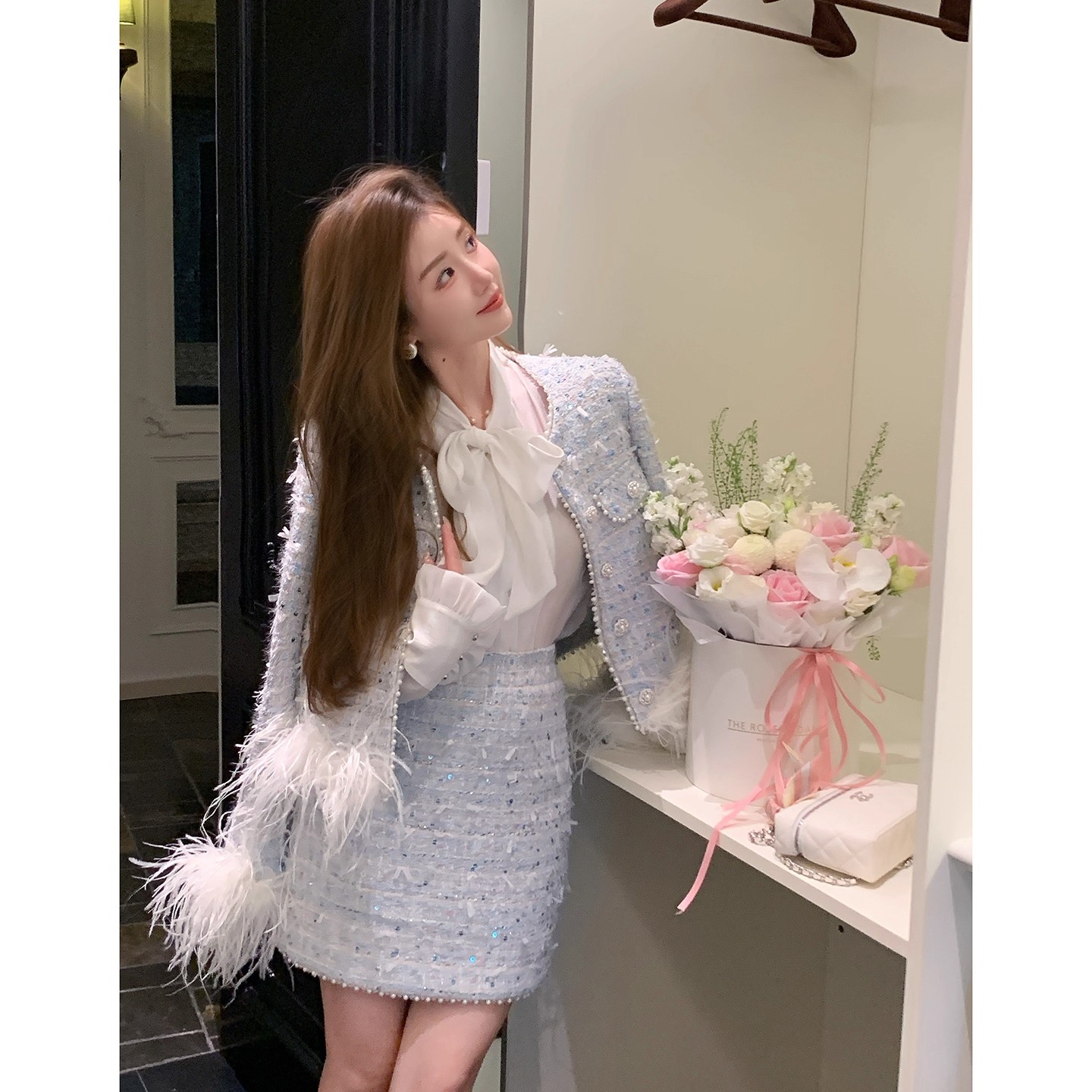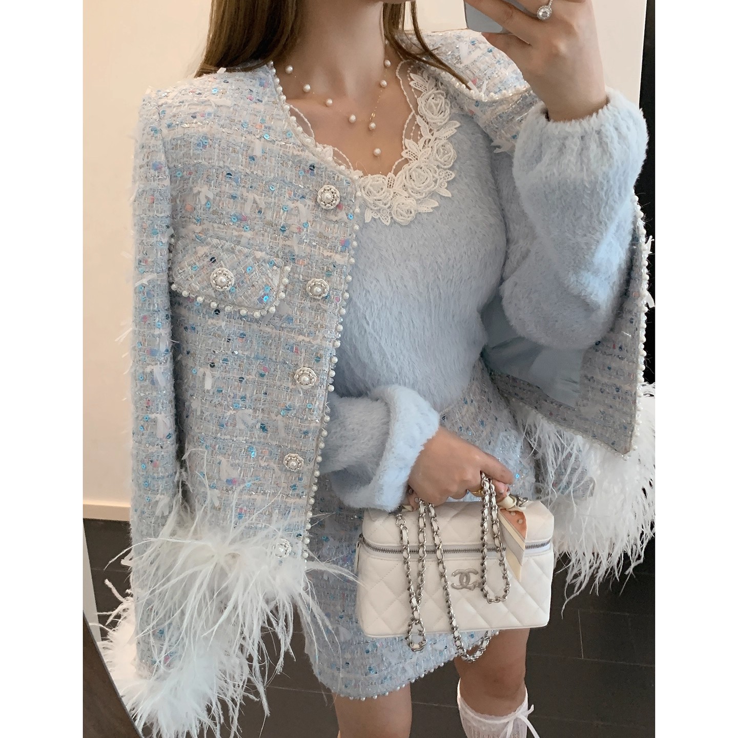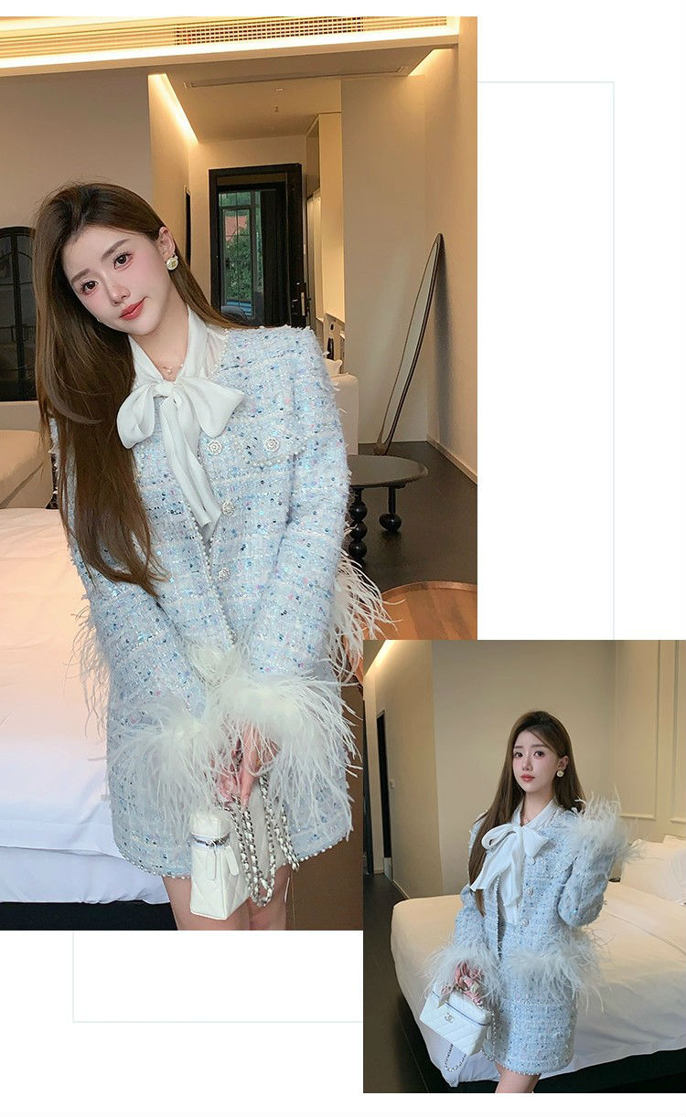 新款春秋法式名媛风鸵鸟毛小香外套高腰短裙套装
