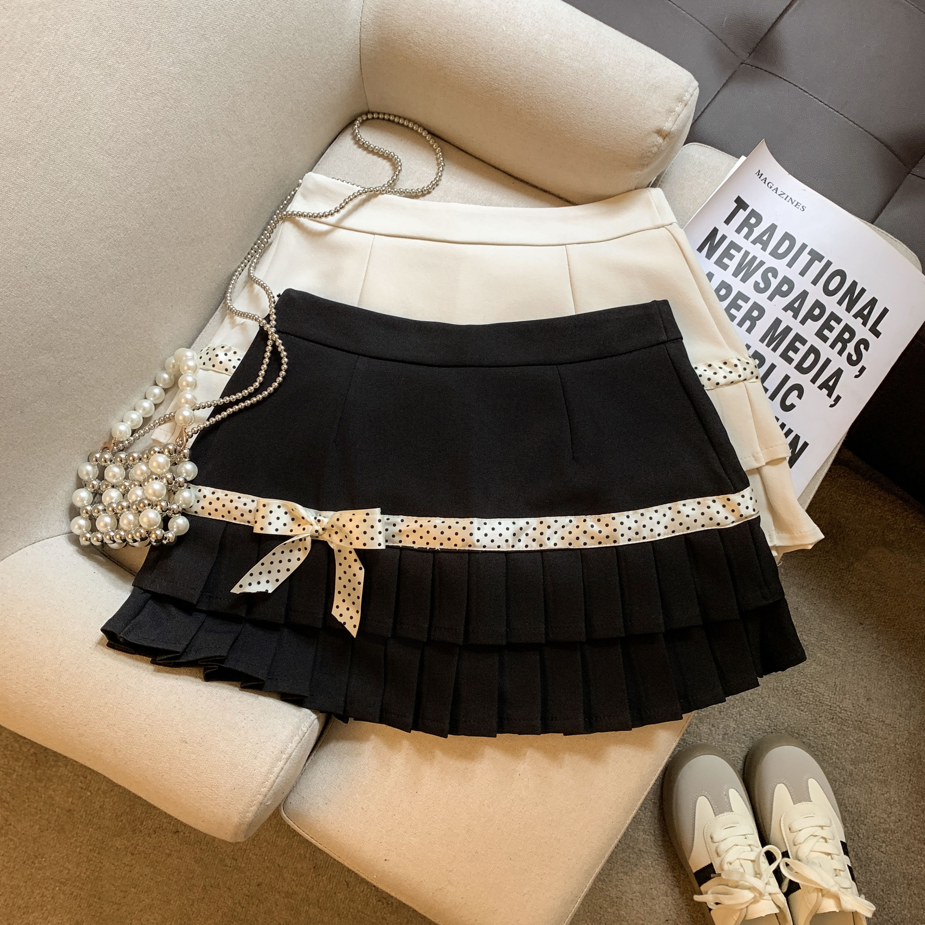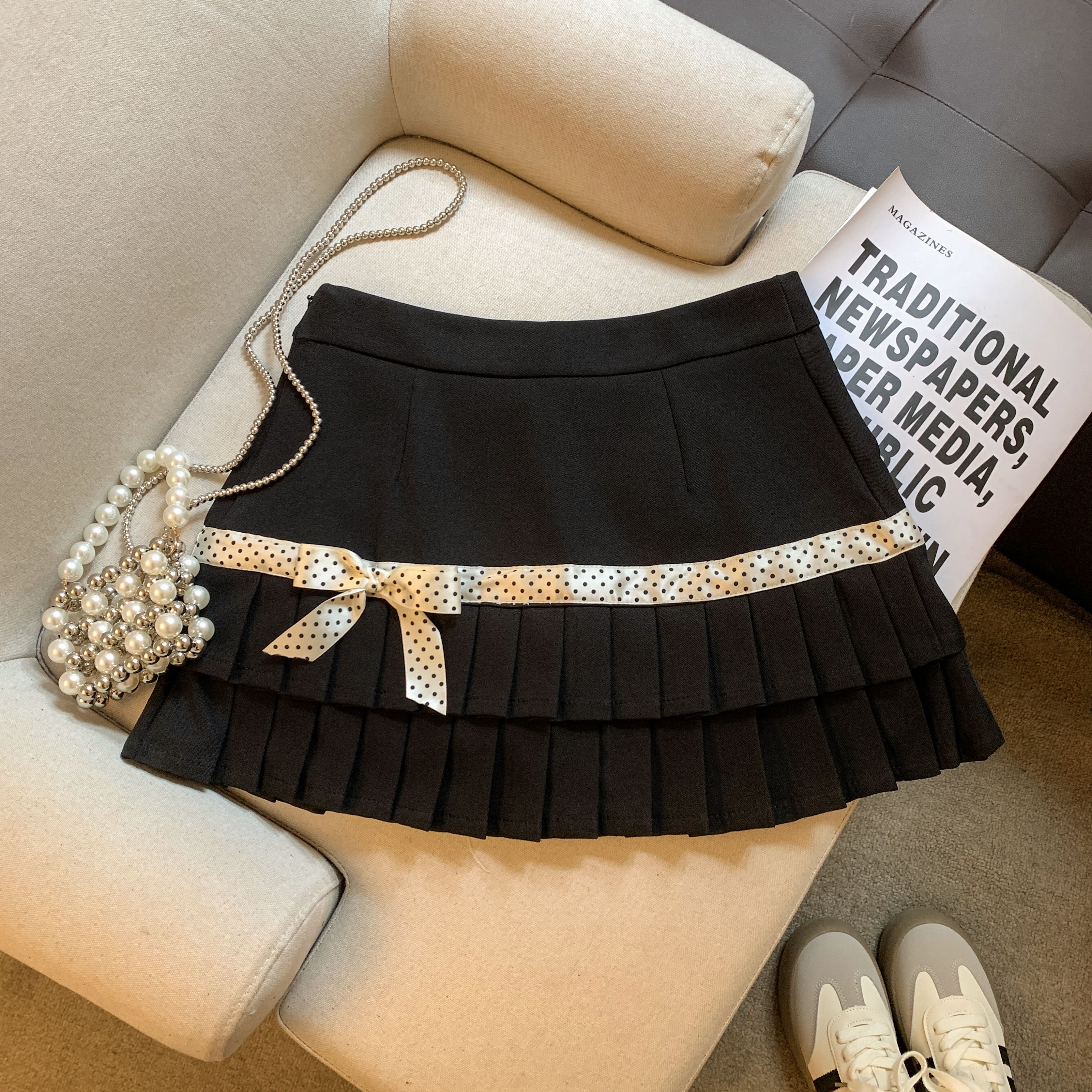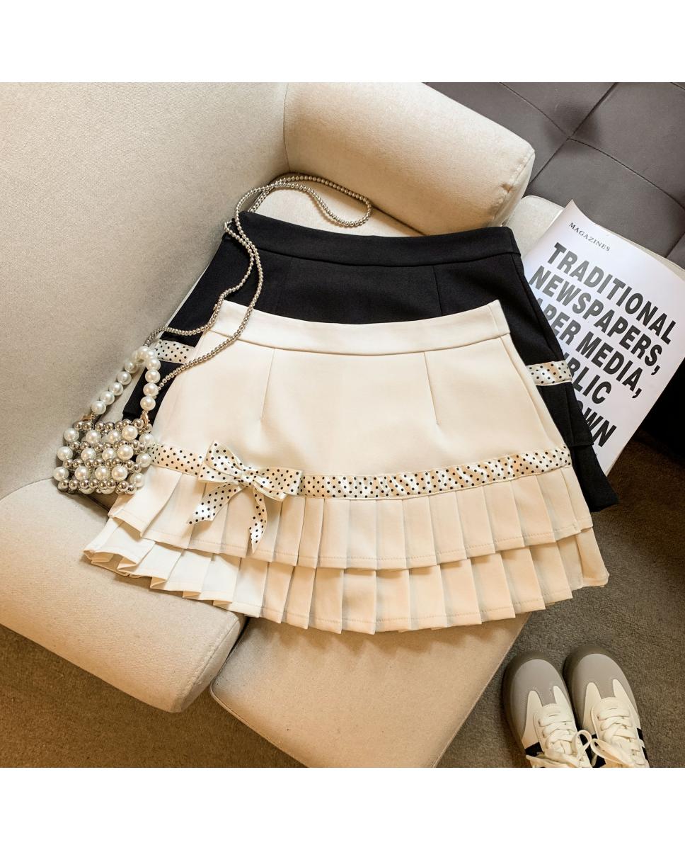 韩系学院风波点百褶半身裙春新款高级感小个子蝴蝶结短裙裤