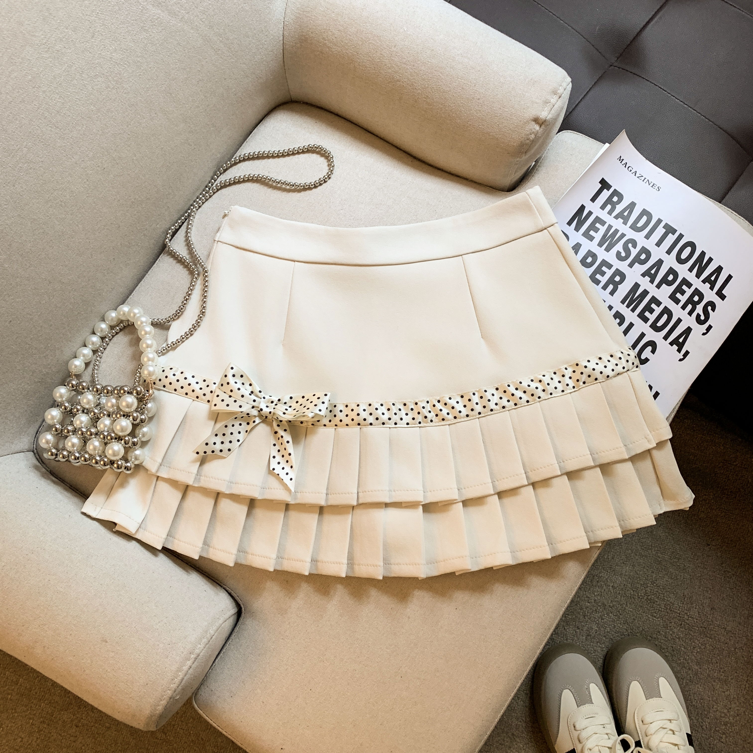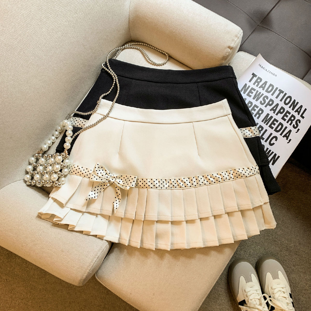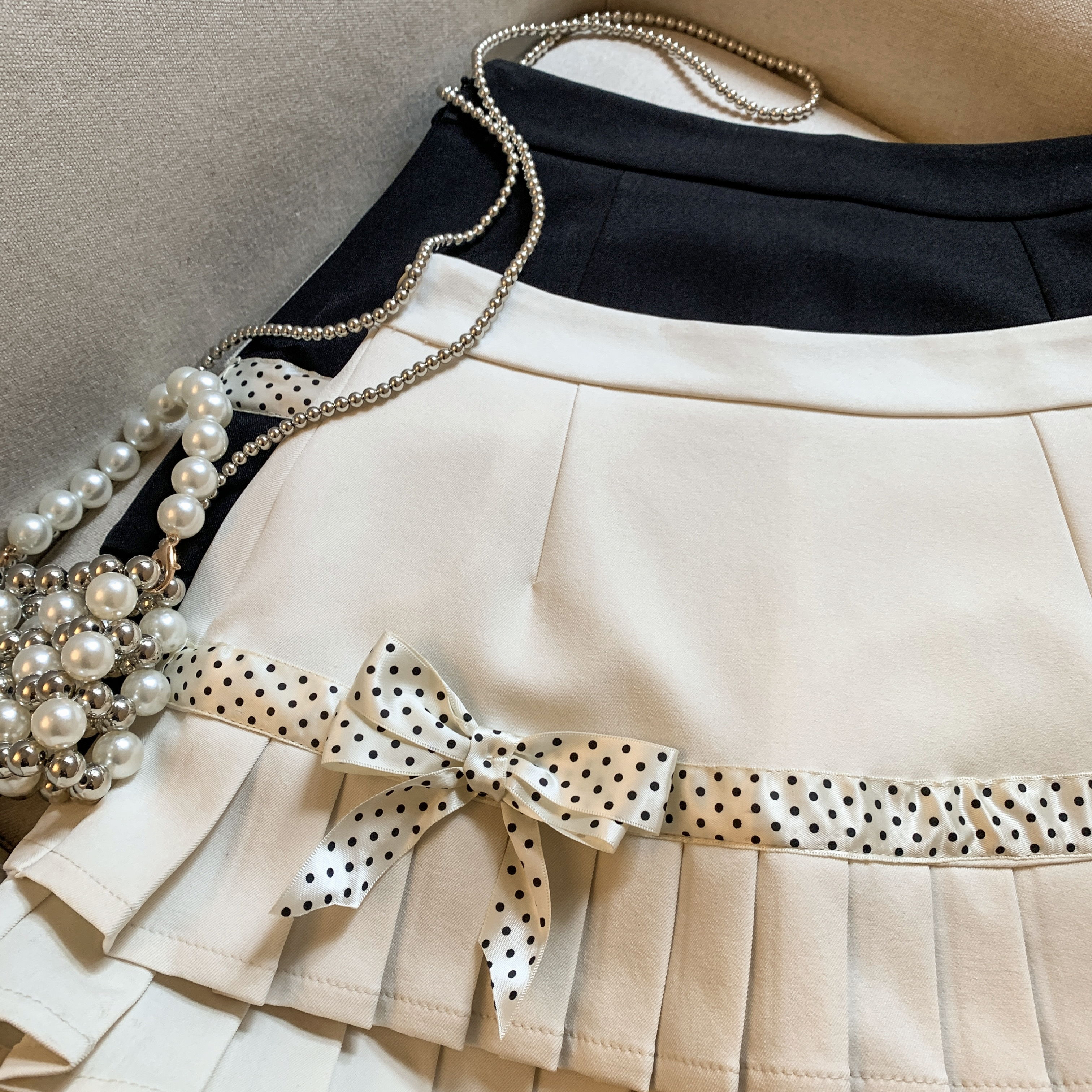 韩系学院风波点百褶半身裙春新款高级感小个子蝴蝶结短裙裤