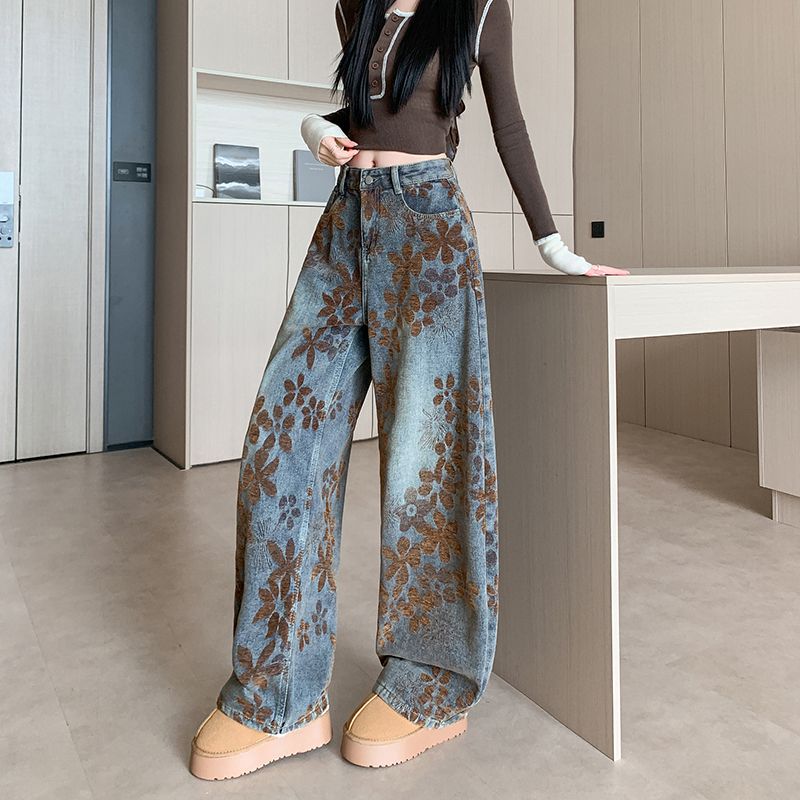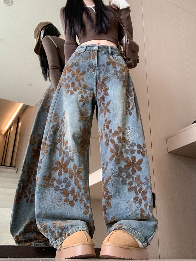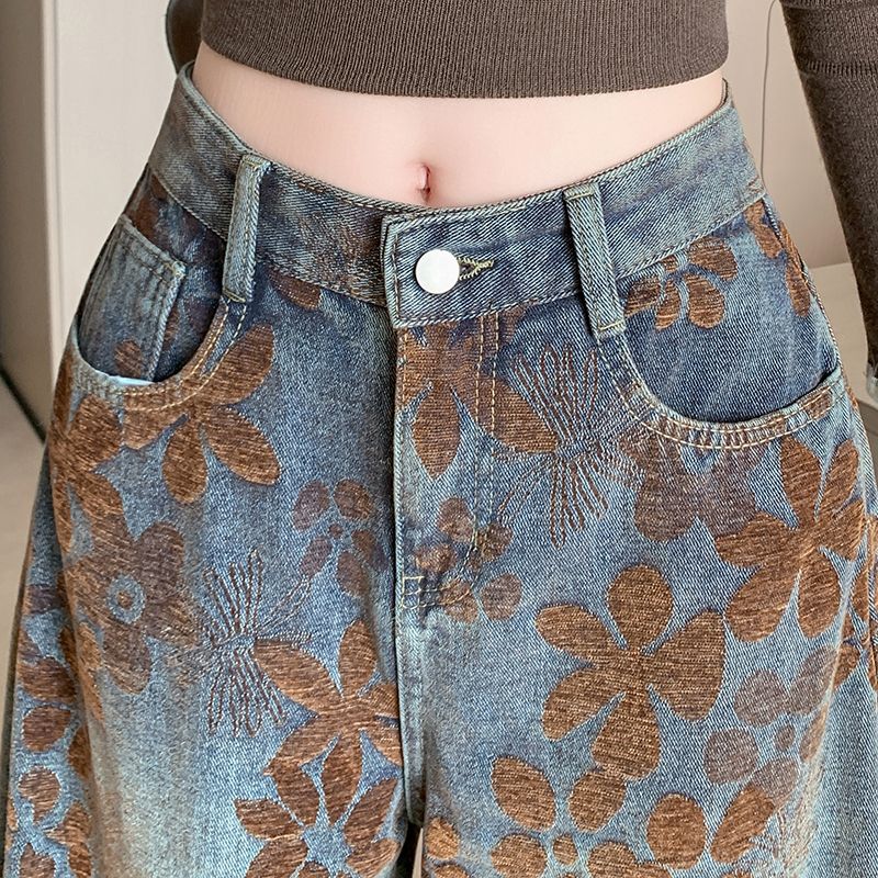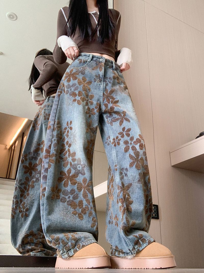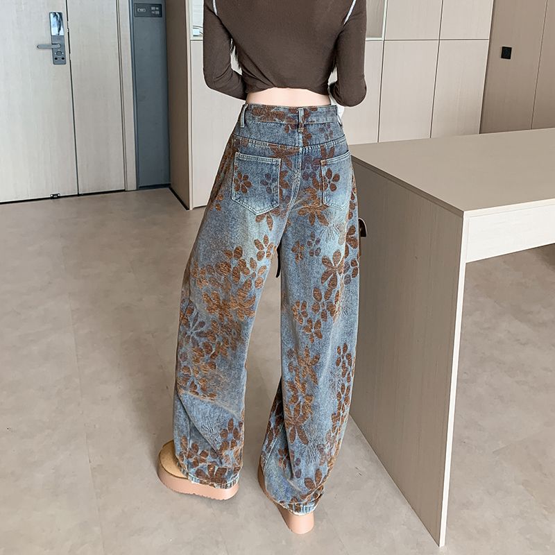 美式做旧印花弯刀牛仔裤新款高腰宽松阔腿镰刀裤