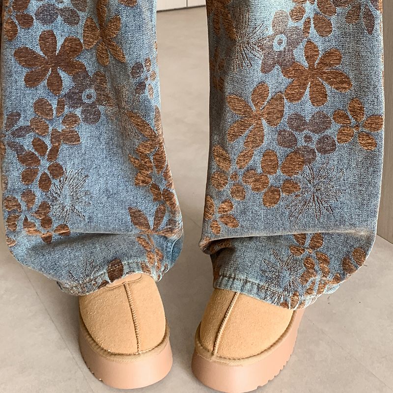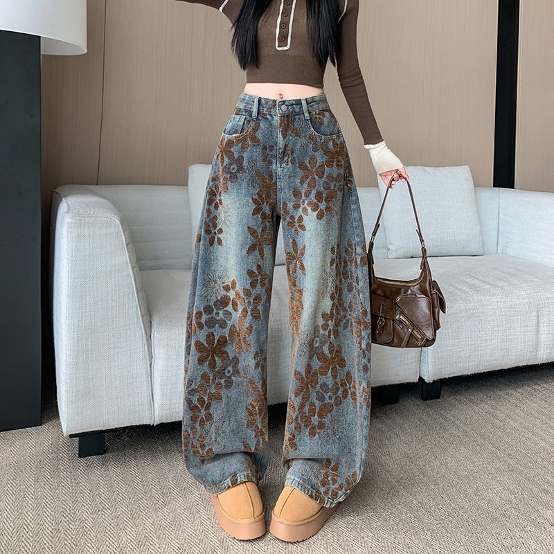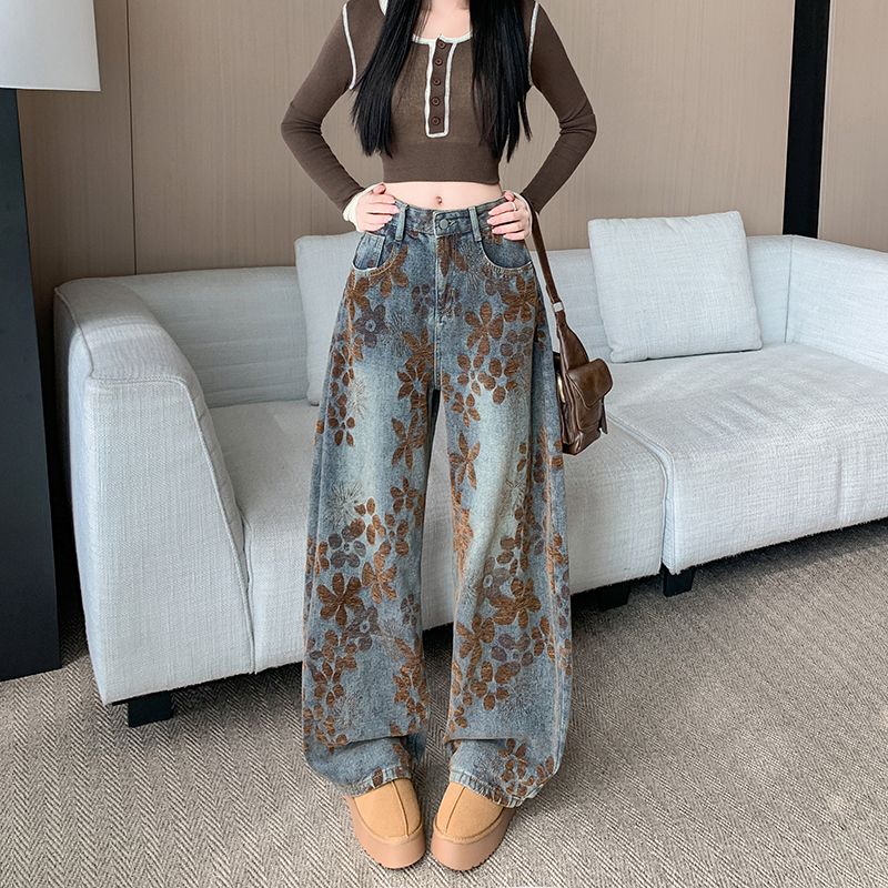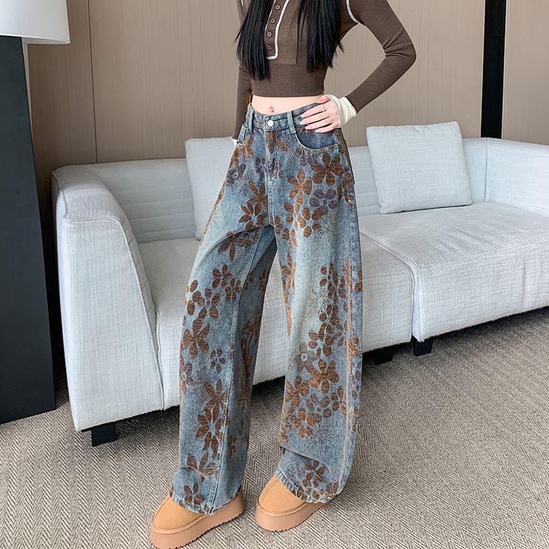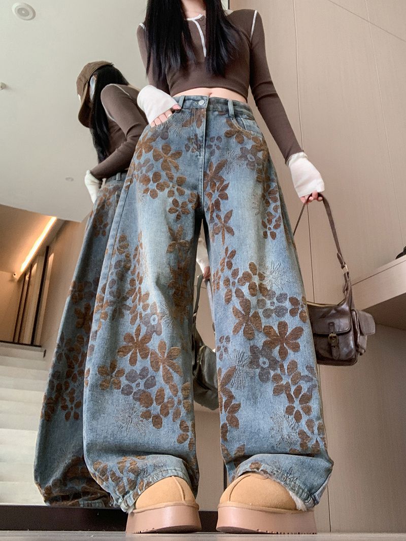 美式做旧印花弯刀牛仔裤新款高腰宽松阔腿镰刀裤